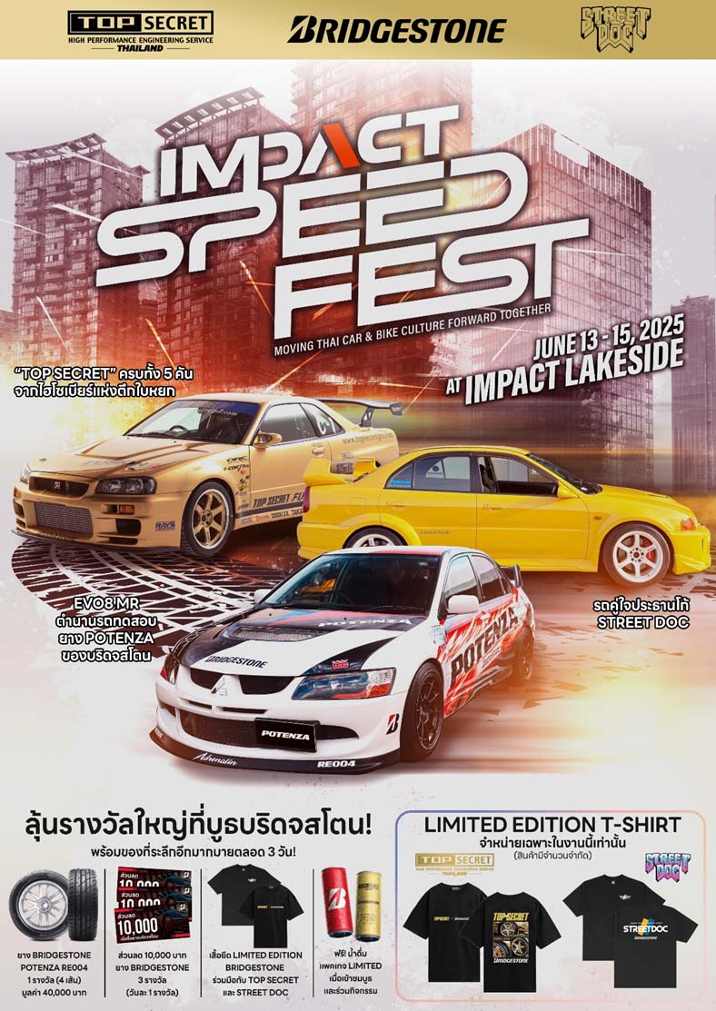 กรุงเทพฯ-(5 มิถุนายน 2568) – บริดจสโตน ตอกย้ำภาพลักษณ์ผู้นำด้านมอเตอร์สปอร์ตระดับโลกและผู้นำด้านนวัตกรรมยางสมรรถนะสูงระดับพรีเมียม ในโอกาสนี้ร่วมกับคุณเบียร์ ใบหยก ยูทูบเบอร์สายรถยนต์ตัวท็อป เจ้าของสำนักแต่งรถยนต์ TOP SECRET THAILAND และคุณโก้ STREET DOC อินฟลูเอนเซอร์สายรถยนต์ชื่อดัง ชวนลูกค้าและเหล่าคนรักรถยนต์และรถจักรยานยนต์ที่ชื่นชอบความเร็วร่วมเปิดประสบการณ์มอเตอร์สปอร์ตสุดเร้าใจกับมหกรรมความเร็วสุดยิ่งใหญ่แบบน็อนสต็อปตลอด 60 ชั่วโมงเต็ม ครั้งแรกในประเทศไทย โดยบริดจสโตนร่วมเป็นผู้สนับสนุนหลักในงาน “IMPACT Speed Fest 2025” ตั้งแต่วันที่ 13 - 15 มิถุนายน 2568 ณ ริมทะเลสาบ เมืองทองธานี