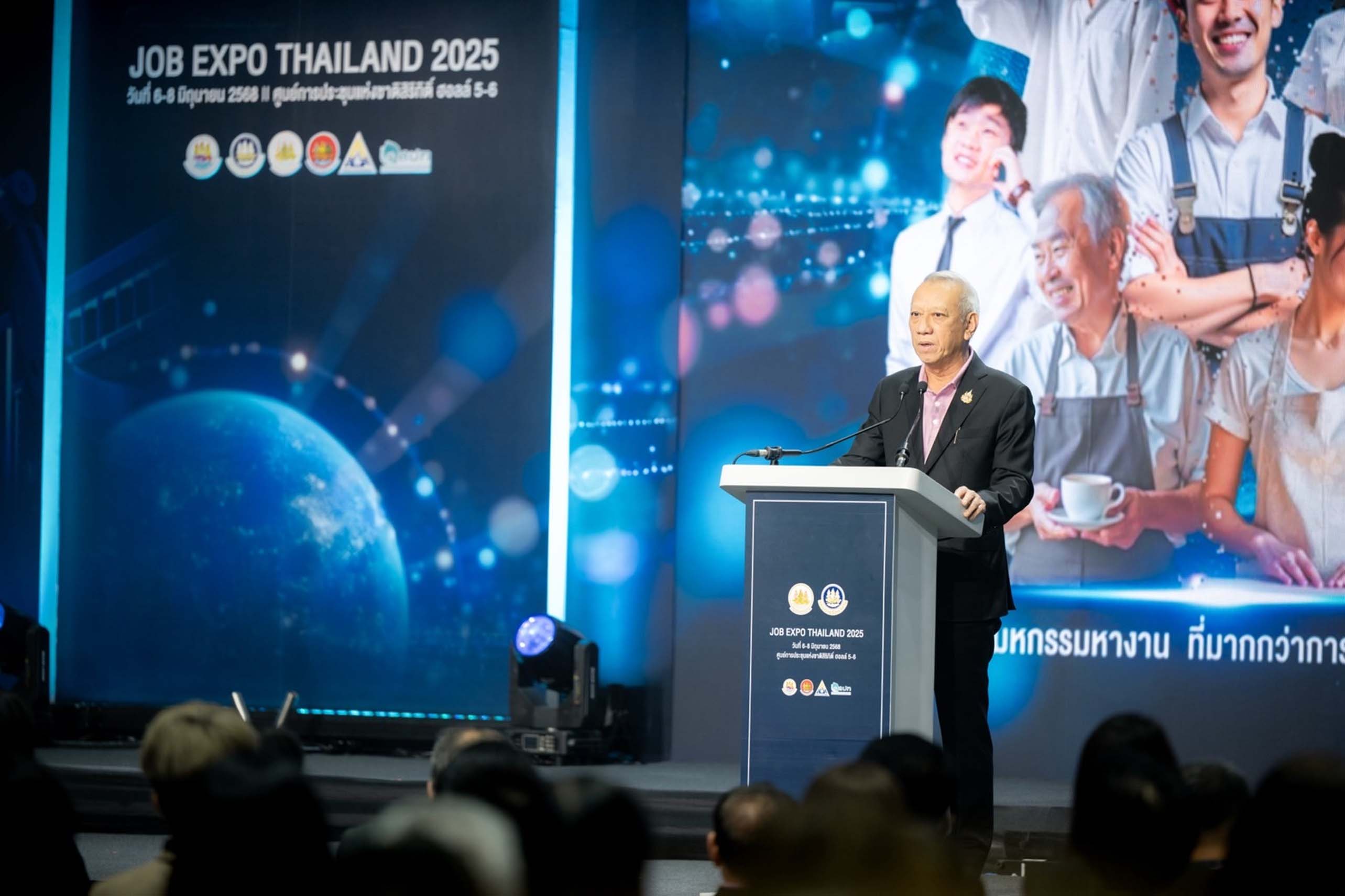 กรุงเทพฯ-6 มิถุนายน 2568 - นายพิพัฒน์ รัชกิจประการ รัฐมนตรีว่าการกระทรวงแรงงาน เป็นประธานพิธีเปิดงาน JOB EXPO THAILAND 2025 : มหกรรมหางาน ที่มากกว่าการหางาน สร้างโอกาสให้ประชาชนทุกกลุ่มทุกช่วงวัยมีอาชีพและรายได้ที่มั่นคง โดยมี นายบุญสงค์ ทัพชัยยุทธ์ ปลัดกระทรวงแรงงาน ผู้บริหารกระทรวงแรงงาน ร่วมเป็นเกียรติ นายสมชาย มรกตศรีวรรณ อธิบดีกรมการจัดหางาน กล่าวรายงานวัตถุประสงค์