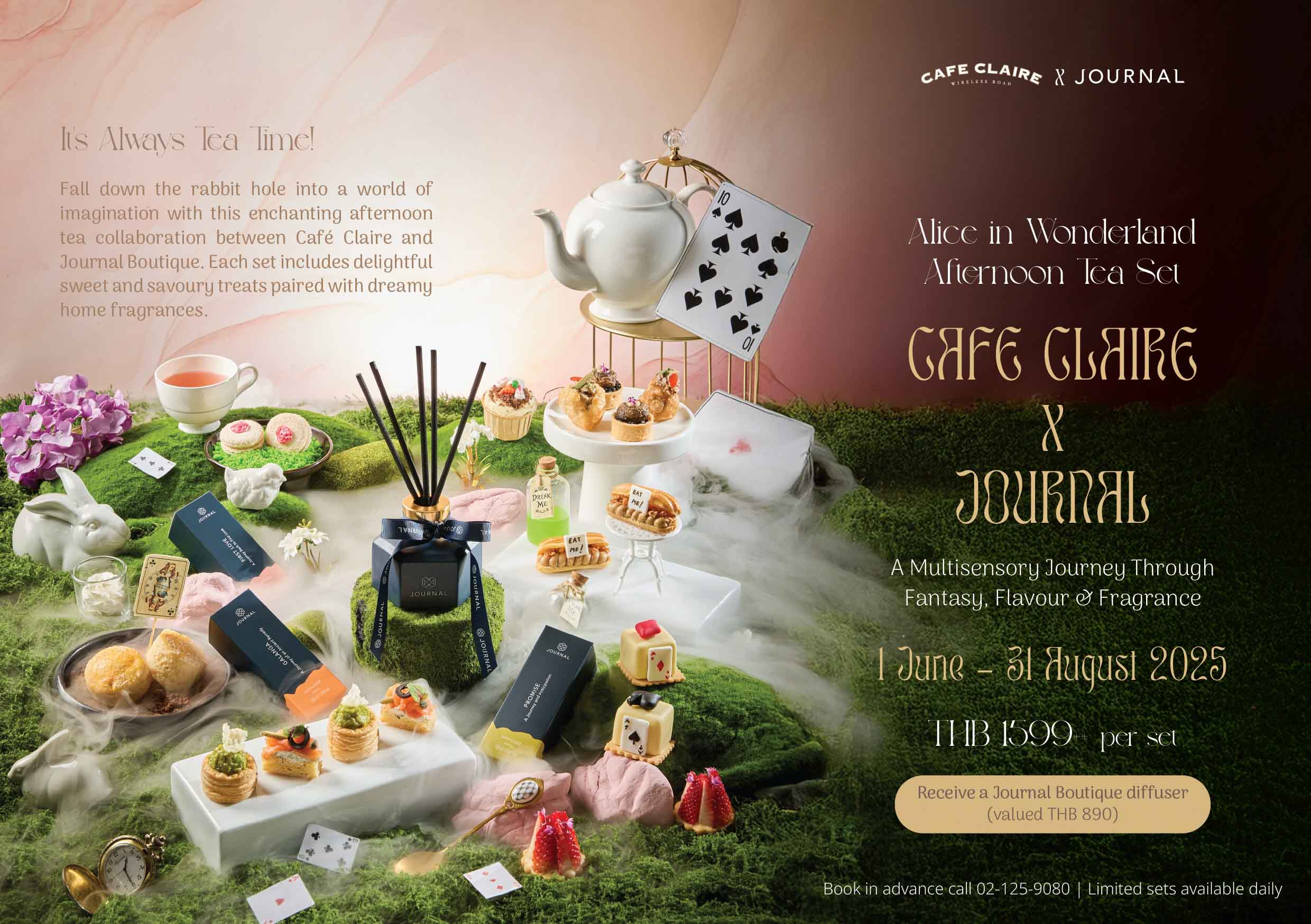 “Alice in Wonderland Afternoon Tea Set”ประสบการณ์ในโลกแห่งจินตนาการที่ให้ความรื่นรมย์ครบทุกมิติมีไว้บรรณาการแด่ทุกท่าน ในเวลาน้ำชายามบ่าย 14:30– 17:30 น. ทุกวัน ณ“คาเฟ่ แคลร์” โอเรียนเต็ล เรสซิเดนซ์ กรุงเทพฯ ถนนวิทยุ ตั้งแต่วันที่1 มิถุนายน ถึง31 สิงหาคม 2568 ในราคา 1,599++ บาท สำหรับ 2 ท่าน และเพื่อให้ความมหัศจรรย์ยังอบอวลอยู่รอบกายไปยาวนาน Journal ขอมอบ Journal Diffuser มูลค่า 890 บาท ให้กับทุกท่านที่มาอิ่มเอมกับชุดน้ำชานิยามใหม่นี้ สำหรับกลับบ้านไปรื่นรมย์กับกลิ่นหอมละมุนที่ไม่อาจลืมเลือน