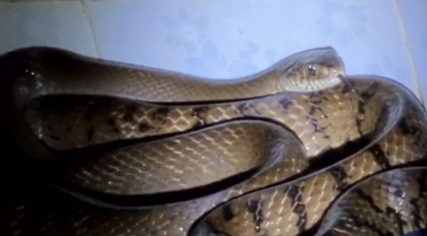 โดยหลังเจ้าหน้าที่กู้ภัยเข้าตรวจสอบพบงูขนาดตัวเขื่อง นอนขดตัวอยู่ในห้องน้ำภายในบ้านหลังดังกล่าว เมื่อเจ้าหน้าที่ใช้ไม้บ่วง สำหรับจับงูไปโดนตัวงู เจ้างูรีบเลื้อยหนีออกมาด้านนอกห้องน้ำ เลื้อยหนีผ่านห้องครัวมาอยู่ในห้องใต้ราวแขวนผ้า อีกห้อง เจ้าหน้าที่พยายามตามจับ โดยใช้เวลาประมาณ 10 นาที จึงสามารถจับเจ้างูตัวดังกล่าวได้