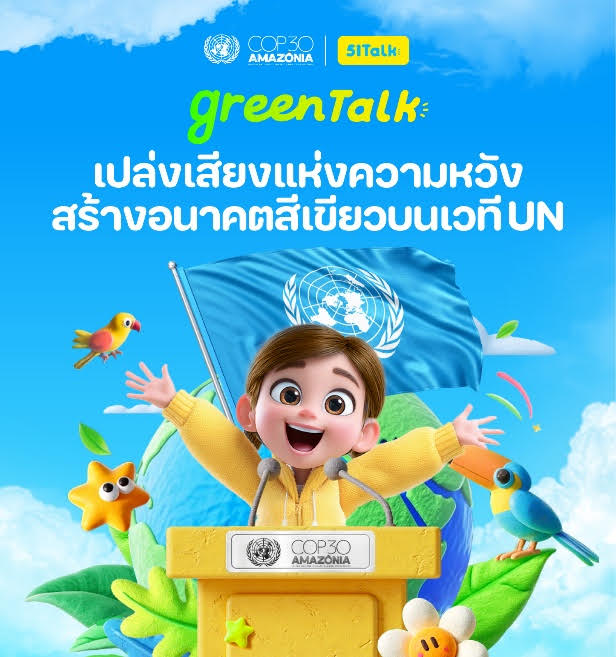 กรุงเทพฯ, ประเทศไทย, วันที่ 16 มิถุนายน 2568: 51Talk (ไฟฟ์วันทอล์ก) แพลตฟอร์มหลักสูตรการศึกษาภาษาอังกฤษออนไลน์สำหรับเยาวชนระดับโลก ครอบคลุมการให้บริการมากกว่า 20 ประเทศทั่วโลกและมีผู้ใช้บริการแล้วกว่า 40 ล้านคน จัดโครงการ “Green Talk เปล่งเสียงแห่งความหวัง สร้างอนาคตสีเขียวบนเวที UN” เปิดโอกาสให้เยาวชนไทยประชันวิสัยทัศน์ด้านความยั่งยืนทางสิ่งแวดล้อมโลกอย่างสร้างสรรค์ เพื่อเป็นตัวแทนประเทศไทยขึ้นกล่าวสุนทรพจน์ที่งานสุดยิ่งใหญ่ระดับโลกอย่าง “การประชุมแห่งสหประชาชาติว่าด้วยการเปลี่ยนแปลงสภาพภูมิอากาศครั้งที่ 30 (the United Nations Climate Change Conference) หรือ COP30” ณ เมืองเบเลง ประเทศบราซิล ตอกย้ำถึงความมุ่งมั่นของ 51Talk ในการส่งเสริมให้เด็กและเยาวชนได้แสดงทักษะการสื่อสารภาษาอังกฤษและความคิดสร้างสรรค์อย่างมั่นใจในการประชุมที่มีความสำคัญระดับโลก