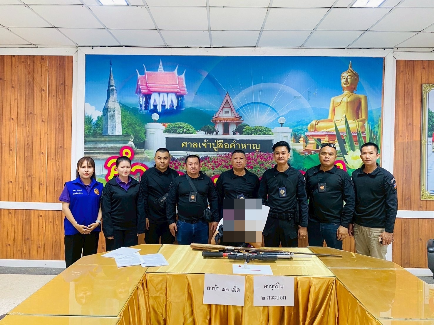 หนองบัวลำภู-เมื่อวันที่ 1 ก.ค.2568 ผู้สื่อข่าวรายงานว่า นายรุ่งเรือง ธิมาบุตร นายอำเภอนากลาง ,พ.ต.อ.ชัยพล คำนอก ผกก.สภ.นากลาง พร้อมกำลังเข้า จับกุมนายเอ (นามสมมุติ) อายุ 44 ปี เป็นครูสอนอยู่โรงเรียนแห่งนึ่งในอำเภอนากลาง จังหวัดหนองบัวลำภู ตรวจยึดยาบ้า 12 เม็ด อาวุธปืนยาวไทยประดิษฐ์ 1 กระบอก ,อาวุธปืนชนิดใช้ส่งเครื่องกระสุนปืนโดยวิธีอัดลม 1 กระบอก ภายในห้องนอนในกระท่อม พร้อมผลตรวจปัสสาวะเป็นสีม่วง สามารถจับกุมได้ที่โรงเรียนแห่งนึ่งในอำเภอนากลาง