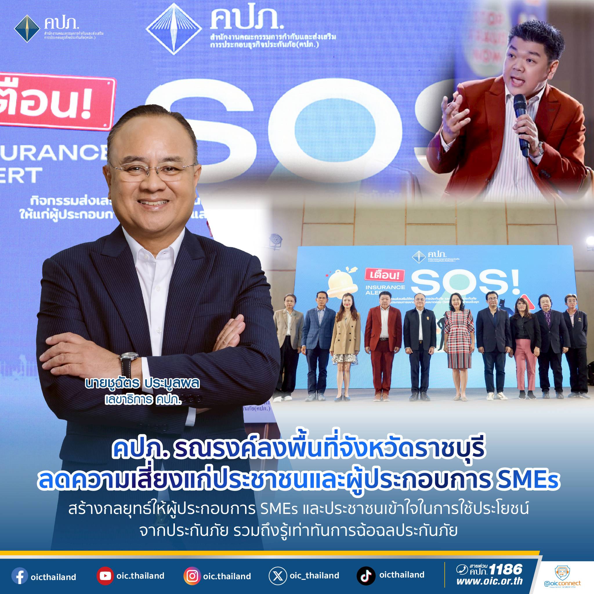 นายชูฉัตร ประมูลผล เลขาธิการ คปภ. ได้กล่าวในตอนหนึ่งว่า “สำนักงาน คปภ. มีภารกิจหนึ่งที่สำคัญคือ การส่งเสริมการประกอบธุรกิจประกันภัย ซึ่งสำนักงานมุ่งเน้นการเสริมสร้างความรู้ ด้านประกันภัยให้กับพี่น้องประชาชน รวมถึงผู้ประกอบการ SMEs” ที่มีอยู่มากมาย ไม่ว่าจะเป็นภาคการเกษตร ภาคอุตสาหกรรมการผลิต ภาคค้าส่งค้าปลีก ภาคการท่องเที่ยวและบริการ และภาคการขนส่ง นอกจากนี้สำนักงาน คปภ. ยังสนับสนุนให้ภาคธุรกิจประกันภัยมีการออกแบบผลิตภัณฑ์ประกันภัยที่สอดคล้องกับสภาพ เศรษฐกิจของแต่ละจังหวัดเพื่อให้สามารถตอบโจทย์ความต้องการของประชาชนผู้ประกอบการในแต่ละจังหวัดได้ ดังนั้น เพื่อสร้างความมั่นคงให้กับธุรกิจ SMEs การประกันภัยจึงมีความสำคัญเป็นอย่างมากต่อการบริหารความเสี่ยงสำหรับการประกอบธุรกิจในปัจจุบัน