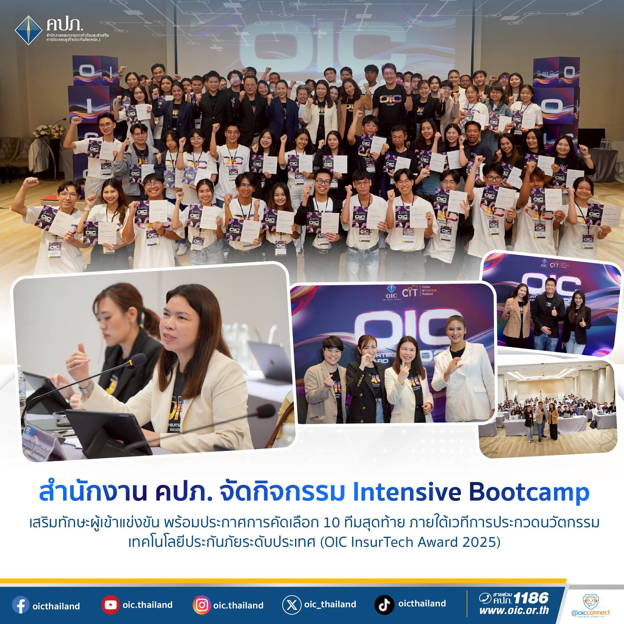 สำนักงานคณะกรรมการกำกับและส่งเสริมการประกอบธุรกิจประกันภัย (สำนักงาน คปภ.) ได้จัดกิจกรรม Intensive Bootcamp ภายใต้โครงการ “OIC InsurTech Award 2025” ระหว่างวันที่ 16 - 17 สิงหาคม 2568 เพื่อเสริมศักยภาพและยกระดับผลงานของผู้เข้าแข่งขัน ด้วยการถ่ายทอดองค์ความรู้และประสบการณ์จากผู้เชี่ยวชาญในหลากหลายด้าน เช่น การถ่ายทอดเทคนิคการสร้างต้นแบบ (Prototype) และกลยุทธ์การต่อยอดจากต้นแบบสู่ผลิตภัณฑ์และบริการที่พร้อมออกสู่ตลาด พร้อมแนะนำเทคนิคการนำเสนอ (Pitching) อย่างมืออาชีพ เพื่อสร้างความประทับใจแก่คณะกรรมการในรอบชิงชนะเลิศ