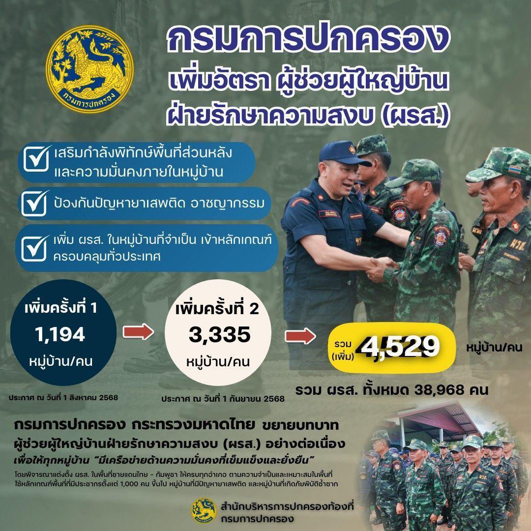 นายภูมิธรรม เวชยชัย รองนายกรัฐมนตรีและรัฐมนตรีว่าการกระทรวงมหาดไทย เปิดเผยในวันนี้ (2 ก.ย. 68) ว่า กระทรวงมหาดไทย ได้เห็นชอบการแต่งตั้งผู้ช่วยผู้ใหญ่บ้านฝ่ายรักษาความสงบ (ผรส.) เพิ่มเติม จำนวน 3,335 หมู่บ้าน (หมู่บ้านละ 1 คน) โดยเน้นหมู่บ้านในพื้นที่ที่เกิดภัยพิบัติบ่อยครั้งและมีความเคลื่อนไหวของผู้ค้าและผู้เสพยาเสพติด รวมถึงหมู่บ้านในอำเภอชายแดนไทย - กัมพูชา ทุกพื้นที่ เพื่อเป็นหลักประกันในการสร้างพื้นที่ทั่วประเทศไทยให้ปลอดภัยสำหรับพี่น้องประชาชนทุกคน ตามนโยบายหลัก “3 ไร้ทุกข์ 5 สร้างสุข หรือ 8 QUICK WINS” ของกระทรวงมหาดไทย