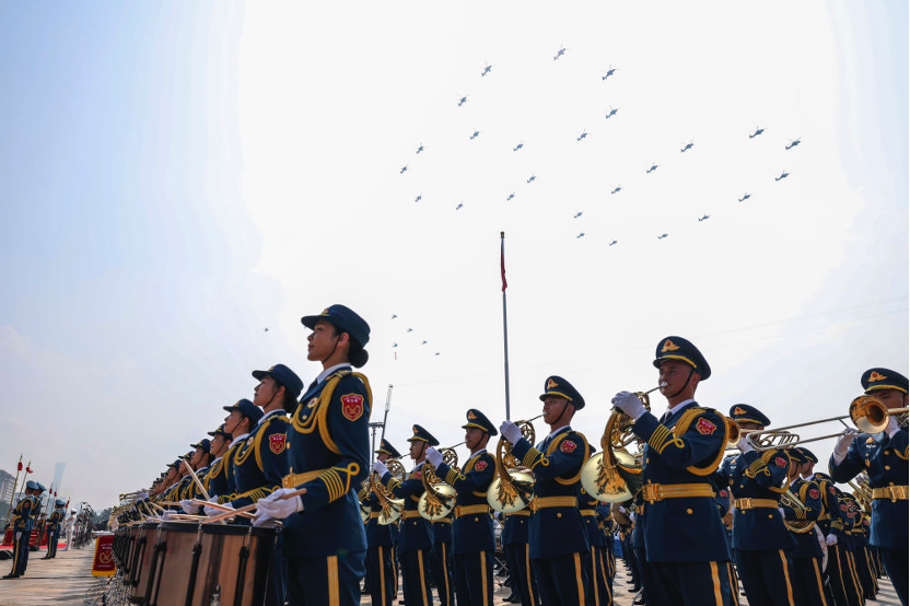 ฝูงเครื่องบินคุ้มกันนำธงชาติจีนบินเหนือจัตุรัสเทียนอันเหมิน