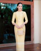 8. ชุดไทยเรือนต้น สีเหลืองทอง ที่ออกแบบให้กับ คุณเบลล่า ราณี แคมเปน สำหรับทำบุญผ้าป่า ถวายวัดสระเกศ ราชวรมหาวิหาร เป็นอีกหนึ่งชุดไทยสุดเรียบหรูดูแพงที่สวยงดงามเหมาะกับสาวสายบุญมากจริงๆ