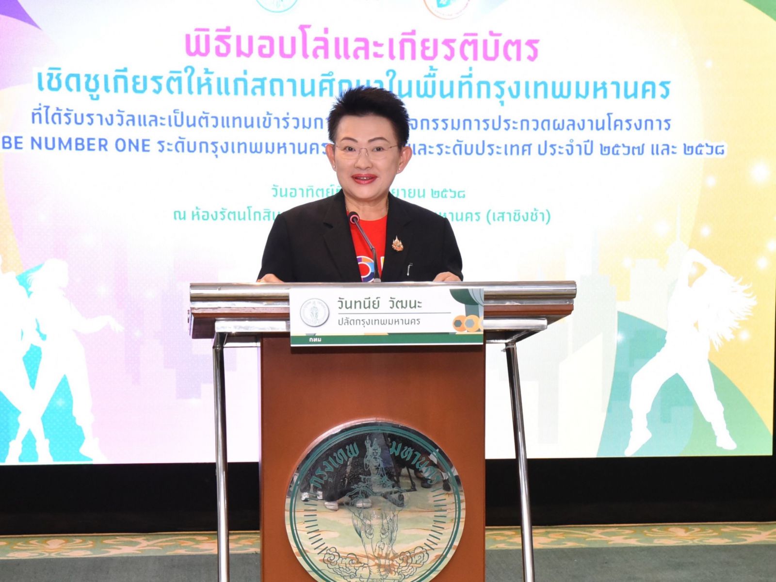 (21 ก.ย. 68) แพทย์หญิงวันทนีย์ วัฒนะ ปลัดกรุงเทพมหานคร เป็นประธานในพิธีมอบโล่และเกียรติบัตรเชิดชูเกียรติการเข้าร่วมกิจกรรมการแข่งขันและการประกวดผลงานโครงการ TO BE NUMBER ONE ระดับกรุงเทพมหานคร ระดับภาค
