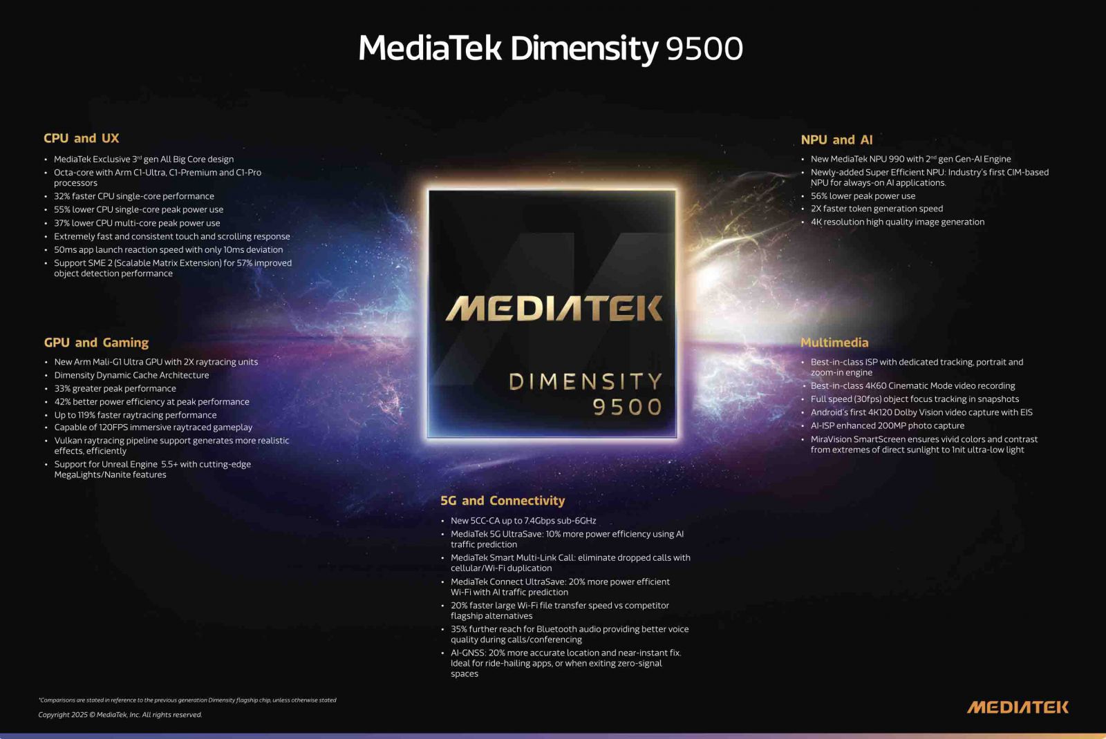 MediaTek Dimensity 9500 ใช้สถาปัตยกรรมซีพียู All Big Core เจเนอเรชันที่ 3 ประกอบด้วย Ultra Core ความเร็ว 4.21GHz Premium core 3 คอร์ และ Performance core 4 คอร์ พร้อมด้วยสตอเรจ UFS 4.1 แบบ Four Lane ทั้งหมดนี้จะช่วยเพิ่มประสิทธิภาพ single-core ให้สูงขึ้นถึง 29% และ multi-core สูงขึ้น 16% เมื่อเทียบกับรุ่นก่อนหน้า ในขณะที่ Ultra Core สามารถลดการใช้พลังงานลงถึง 55% ขณะทำงานที่ประสิทธิภาพสูงสุด ทำให้ใช้งานแบตเตอรี่ได้ยาวนานและทำงานได้มีประสิทธิภาพยิ่งขึ้น