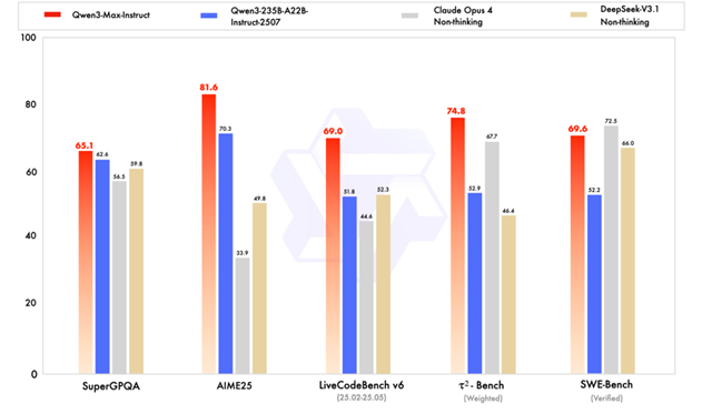 อาลีบาบา ได้เปิดตัว Qwen3-Max อย่างเป็นทางการในฐานะโมเดล LLM ขนาดใหญ่ที่สุดที่มีพารามิเตอร์กว่า 1 ล้านล้านตัว ด้วยโหมด Instruct (non-thinking) และ Thinking โมเดลนี้บรรลุประสิทธิภาพที่น่าประทับใจในการทำเบนช์มาร์ก (benmarks) ที่หลากหลาย โดยเฉพาะอย่างยิ่งในการสร้างโค้ดและความสามารถของเอเจนต์ สำหรับโหมด instruct ได้คะแนน 69.6 ใน SWE-Bench ซึ่งเป็นเบนช์มาร์กมาตรฐานสำหรับการประเมิน LLM ในประเด็นการใช้งานซอฟต์แวร์จริง ซึ่งเทียบเท่ากับโมเดลปิดชั้นนำบางรุ่น นอกจากนี้ยังทำสถิติคะแนนประสิทธิภาพที่โดดเด่นใน Tau2-Bench ซึ่งเป็นเบนช์มาร์กที่ประเมินเอเจนต์สนทนา แสดงให้เห็นถึงความเชี่ยวชาญพิเศษในการใช้เครื่องมือ ที่ถือเป็นความสามารถพื้นฐานสำหรับการสร้างเอเจนต์ที่ชาญฉลาดและเน้นการดำเนินการ