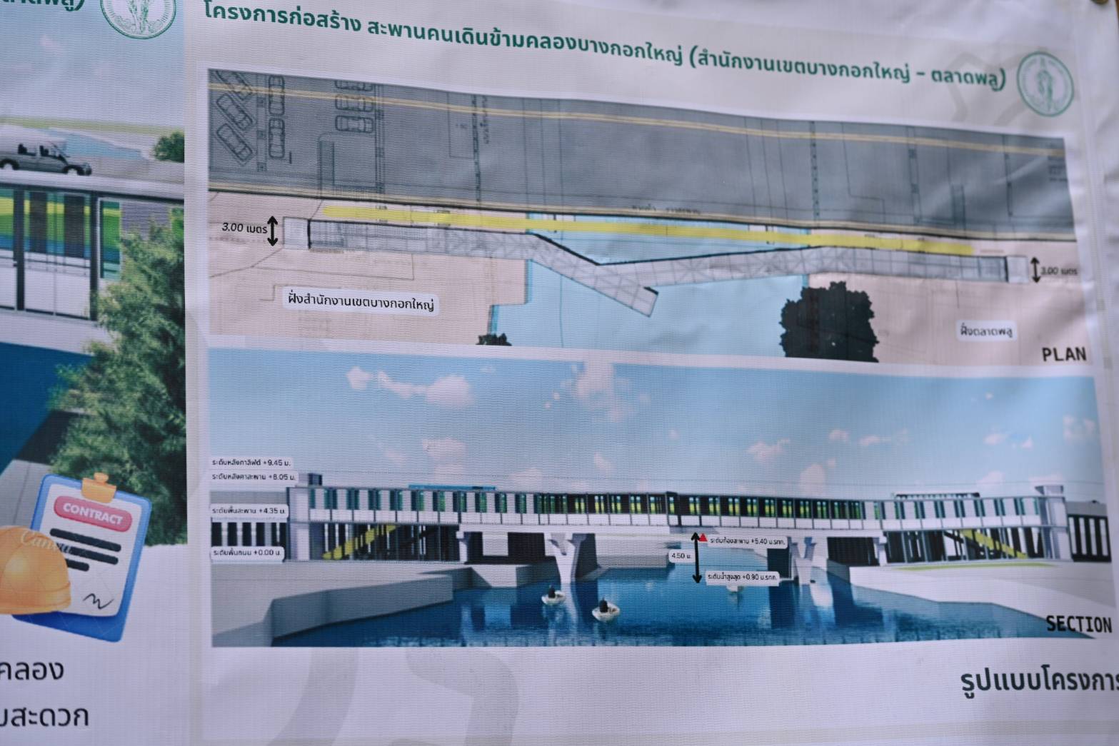 ทั้งนี้ โครงการก่อสร้างสะพานคนเดินข้ามคลองบางกอกใหญ่ (สำนักงานเขตบางกอกใหญ่ - ตลาดพลู) เป็นสะพานกว้าง 3 เมตร ยาวประมาณ 100 เมตร พร้อมปรับปรุงทางเท้าในบริเวณใกล้เคียง ระบบไฟฟ้าแสงสว่าง ระบบระบายน้ำ และส่วนประกอบอื่น ๆ ที่เกี่ยวข้อง ใช้ระยะเวลาก่อสร้างตามสัญญา 360 วัน เป็นไปตามนโยบายของกรุงเทพมหานคร ที่จะพัฒนาเมืองภายใต้แนวทาง "กรุงเทพฯ 9 ด้าน 9 ดี" เพื่อยกระดับคุณภาพชีวิตประชาชนทุกกลุ่มอย่างเท่าเทียม โดยเฉพาะด้าน "เดินทางดี" และ "ปลอดภัยดี" ที่มุ่งเน้นการพัฒนาโครงสร้างพื้นฐานตามแนวคิด Universal Design ให้คนพิการ ผู้สูงอายุ และประชาชนทั่วไปสามารถเข้าถึงการเดินทางที่สะดวก ปลอดภัย และมีคุณภาพชีวิตที่ดียิ่งขึ้น และในส่วนของโครงการถนนคนเดินกระตุ้นเศรษฐกิจ ตลาดพลู Night Walking Street เกิดขึ้นจากความร่วมมือของคณะขับเคลื่อนการมีส่วนร่วมเพื่อการพัฒนาเขตธนบุรีกับสำนักงานเขตธนบุรี โดยมีวัตถุประสงค์เพื่อกระตุ้นเศรษฐกิจและส่งเสริมย่านสร้างสรรค์ตลาดพลู