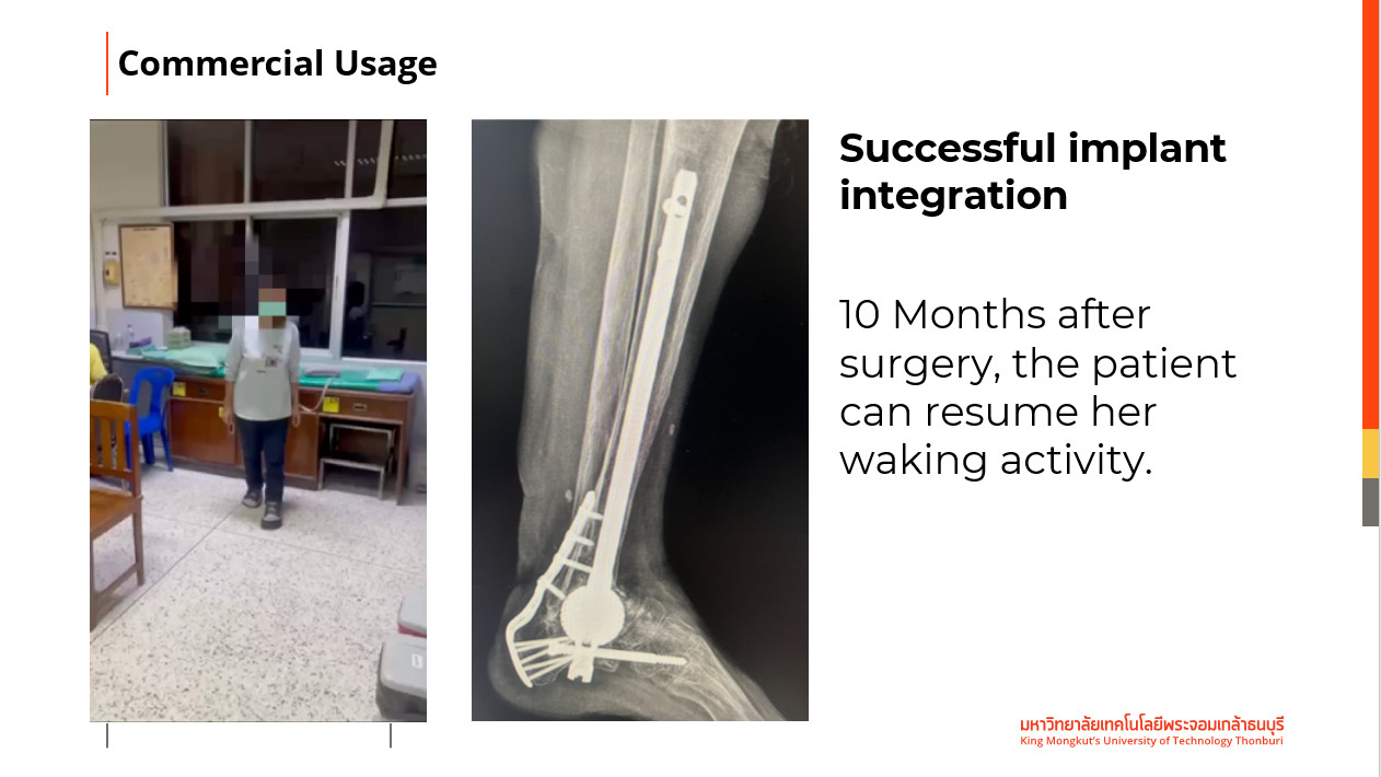 รองศาสตราจารย์ ดร.พชรพิชญ์ เล่าว่า จากแนวคิดที่เริ่มต้นเป็นเพียงงานวิจัยขั้นพื้นฐานเมื่อกว่า 2 ปีก่อน ที่ทีมวิจัยเชื่อว่าน่าจะสามารถต่อยอดไปสู่อุปกรณ์ทางการแพทย์ได้ ปัจจุบันได้พัฒนาและนำไปใช้จริงกับผู้ป่วยแล้ว ทั้งจากการติดต่อโดยตรงของผู้ป่วยและจากการส่งต่อโดยแพทย์เจ้าของไข้ ตัวอย่างเช่น กลุ่มผู้ป่วยข้อเท้าเสื่อมที่มีภาวะกระดูกติดเชื้อจากโรงพยาบาลตรัง จำนวน 7 ราย ซึ่งนำเทคโนโลยีโครงสร้างวัสดุพรุนจาก 3D Printing มาช่วยแพทย์ในการผ่าตัดรักษา ผลลัพธ์พบว่า ภายใน 1 ปี ผู้ป่วยสามารถกลับมาเดินได้ตามปกติทุกคน จากเดิมที่ผู้ป่วยบางรายมีความเสี่ยงต้องถูกตัดขาและไม่สามารถใช้ชีวิตได้อย่างปกติ นวัตกรรมนี้ช่วยเปลี่ยนคุณภาพชีวิตของพวกเขาไปอย่างสิ้นเชิง ความสำเร็จดังกล่าวยังนำไปสู่การยื่นจดสิทธิบัตรในประเทศสหรัฐอเมริกา ร่วมกับ นายแพทย์จรวด จำปา อาจารย์แพทย์โรงพยาบาลตรัง เพื่อขยายการใช้งานอุปกรณ์สู่ระดับนานาชาติ โดยเฉพาะอย่างยิ่งกับโรคเบาหวานที่ถือเป็นปัญหาสาธารณสุขสำคัญทั่วโลก