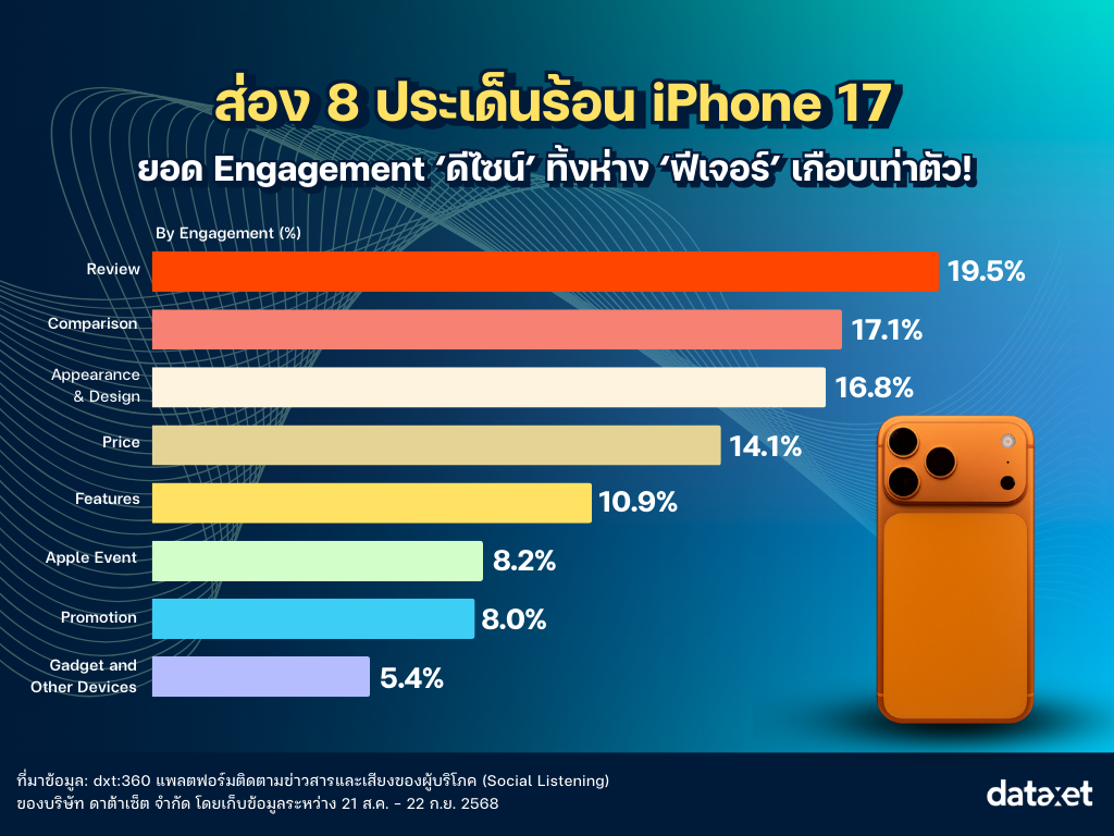 ส่อง 8 ประเด็นร้อน iPhone 17: ยอด Engagement ‘ดีไซน์’ ทิ้งห่าง ‘ฟีเจอร์’ เกือบเท่าตัว!