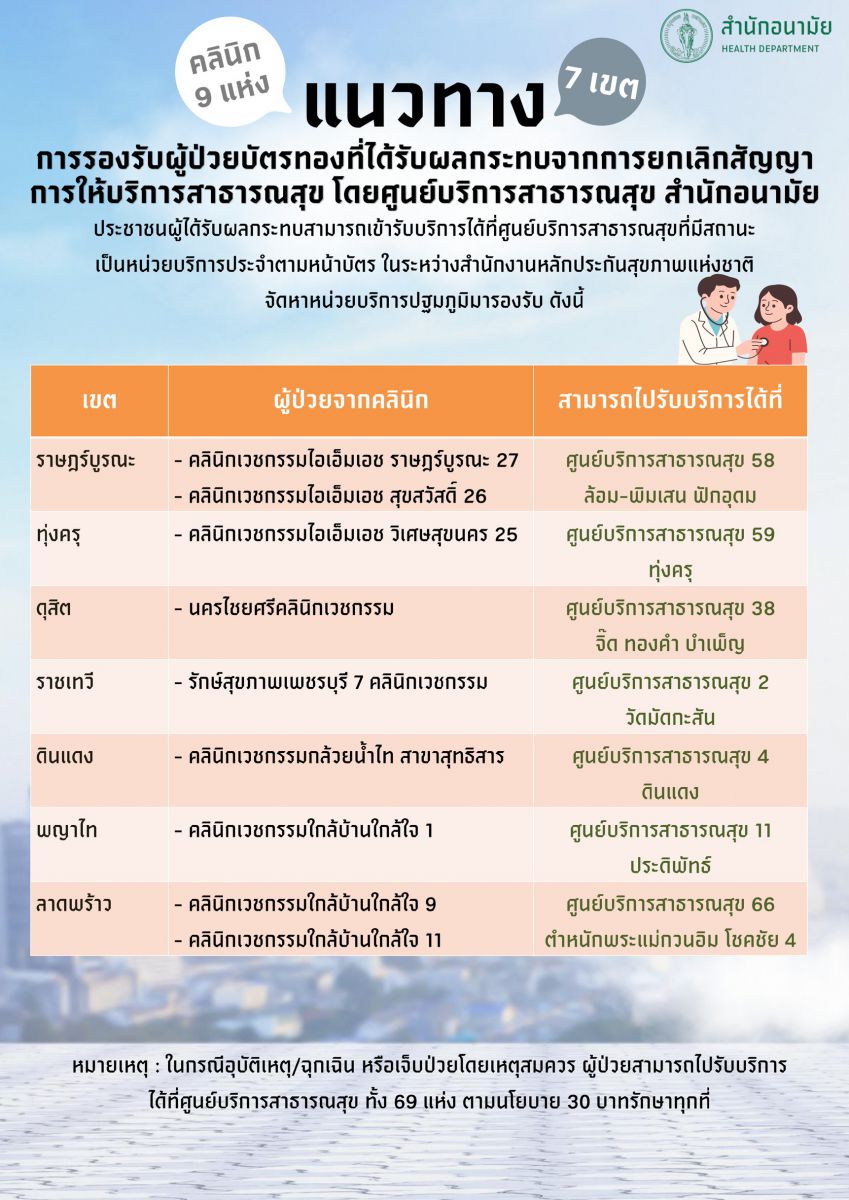 กรุงเทพฯ-นางดวงพร ปิณจีเสคิกุล ผู้อำนวยการสำนักอนามัย (สนอ.) กทม. กล่าวถึงการเตรียมความพร้อมของศูนย์บริการสาธารณสุข กทม. ในการรองรับผู้ป่วยที่อยู่ในสิทธิบัตรทองในพื้นที่กรุงเทพฯ ที่ได้รับผลกระทบจากคลินิกชุมชนอบอุ่นและหน่วยบริการปฐมภูมิ โรงพยาบาลเอกชนขอถอนตัวจากระบบประกันสุขภาแห่งชาติว่า กรณีดังกล่าว สำนักงานหลักประกันสุขภาพแห่งชาติ (สปสช.) เขต 13 ประสานงานเพื่อรองรับผู้ป่วยสิทธิบัตรทอง หลังมีคลินิกชุมชนอบอุ่น 24 แห่ง และหน่วยบริการปฐมภูมิของโรงพยาบาลเอกชน 25 แห่ง ประกาศถอนตัวออกจากระบบบัตรทองตั้งแต่วันที่ 1 ต.ค. 68 ซึ่งส่งผลกระทบต่อประชาชนจำนวนมาก ศูนย์บริการสาธารณสุข กทม. ยังคงเป็นหน่วยบริการประจำให้กับประชาชน 51,874 คน ที่ได้รับผลกระทบ พร้อมให้การดูแลรักษาในระหว่างที่ สปสช. อยู่ระหว่างจัดหาหน่วยบริการปฐมภูมิมารองรับ โดยได้จัดทำสื่อประชาสัมพันธ์ในรูปแบบอินโฟกราฟิกเผยแพร่ผ่านเว็บไซต์และเพจเฟซบุ๊กของ สนอ. รวมถึงช่องทางของศูนย์บริการสาธารณสุขทุกแห่ง เพื่อสร้างการรับรู้แก่ประชาชนอย่างทั่วถึง