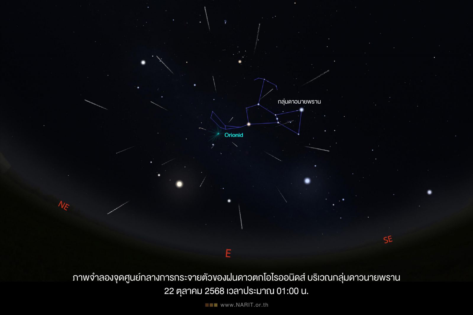 นายศุภฤกษ์ คฤหานนท์ ผู้ช่วยผู้อำนวยการสถาบันวิจัยดาราศาสตร์แห่งชาติ เปิดเผยว่า “ฝนดาวตกโอไรออนิดส์” หรือฝนดาวตกในกลุ่มดาวนายพราน จะเกิดขึ้นในช่วงวันที่ 2 ตุลาคม ถึง 7 พฤศจิกายน ของทุกปี สำหรับในปี 2568 คาดว่ามีอัตราการตกสูงสุดเฉลี่ยประมาณ 20 ดวงต่อชั่วโมง ในคืน 21 ต่อเนื่องถึงรุ่งเช้า 22 ตุลาคม 2568 เริ่มสังเกตการณ์ได้ตั้งแต่เวลาประมาณ 22.30 น. ของวันที่ 21 ตุลาคม โดยจุดศูนย์กลางการกระจายตัวของฝนดาวตกจะอยู่บริเวณแขนของกลุ่มดาวนายพราน ปรากฏขึ้นทางทิศตะวันออก จากนั้นจะค่อย ๆ เคลื่อนสูงขึ้นสู่บริเวณกลางท้องฟ้า และสามารถเฝ้าชมได้ตลอดทั้งคืนจนถึงรุ่งเช้า