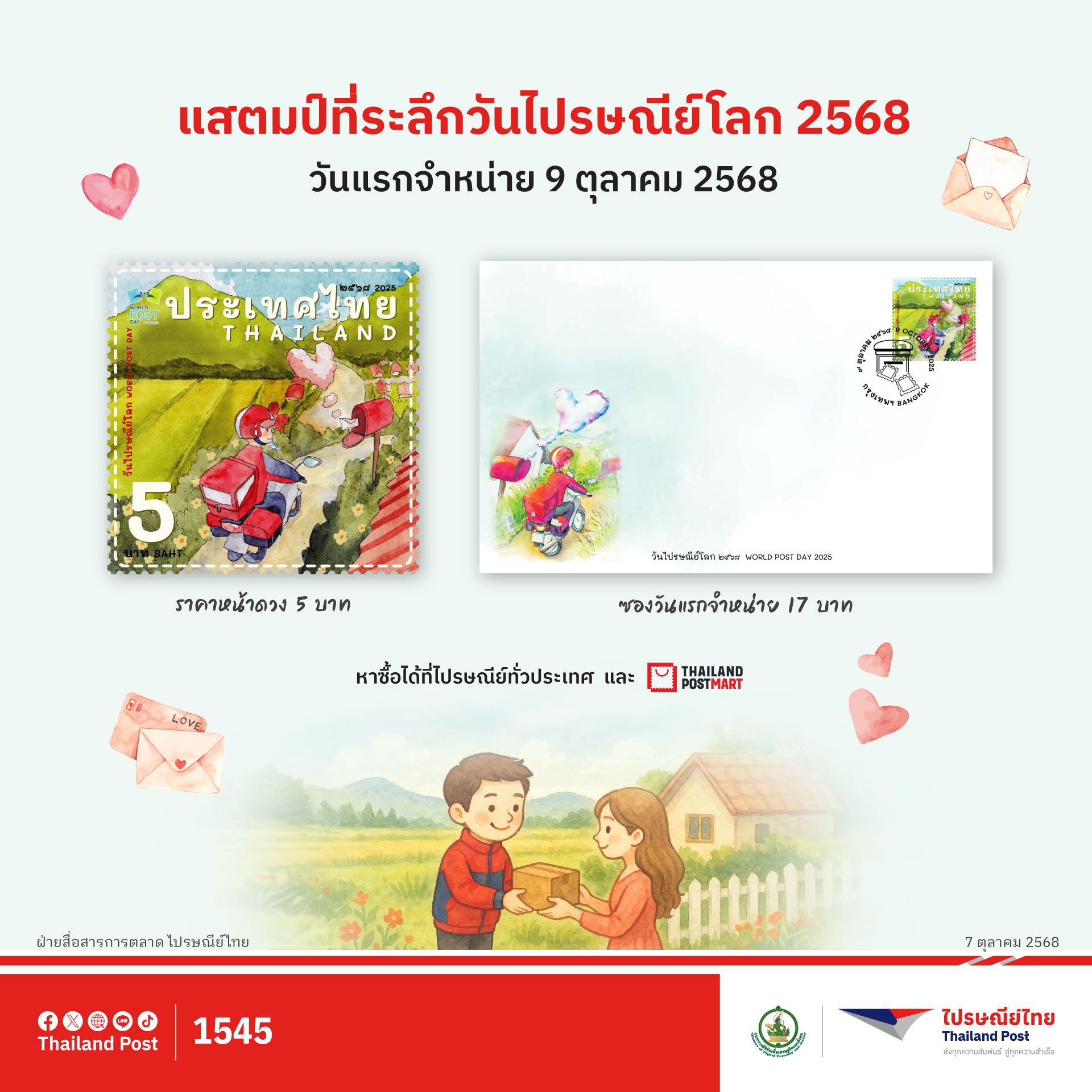 กรุงเทพฯ 7 ตุลาคม 2568 - บริษัท ไปรษณีย์ไทย จำกัด เปิดตัวแสตมป์ที่ระลึกชุดวันไปรษณีย์โลก 2568 ภายใต้แนวคิด “ส่งทุกความสัมพันธ์สู่ทุกความสำเร็จ” ถ่ายทอดผ่านผลงานการออกแบบของ น.ส.กนกวรรณ สาริพันธ์ เยาวชนคนรุ่นใหม่ที่ได้รับรางวัลรองชนะเลิศอันดับ 2 จากการประกวดออกแบบแสตมป์และผลิตภัณฑ์ต้นแบบ Prototype โดยนำเสนอภาพบุรุษไปรษณีย์ขี่จักรยานยนต์ส่งพัสดุ ซึ่งสะท้อนบทบาทสำคัญและความทุ่มเทของไปรษณีย์ไทยในการเชื่อมโยงผู้ส่งและผู้รับให้ใกล้ชิดกันมากขึ้น ทั้งในมิติชีวิตประจำวัน เศรษฐกิจ และสังคมโลก โดยแสตมป์ที่ระลึกชุดนี้ จำหน่ายราคาดวงละ 5 บาท 1 แผ่นมี 10 ดวง ซองวันแรกจำหน่ายราคา 17 บาท ผู้สนใจสามารถซื้อได้ที่พิพิธภัณฑ์แสตมป์ไทยสามเสนใน (BTS สะพานควาย) รวมถึงที่ทำการไปรษณีย์ในกรุงเทพฯ และทุกจังหวัด เริ่มจำหน่ายวันแรก 9 ต.ค. 68 นี้ ซึ่งตรงกับวันไปรษณีย์โลก (World Post Day)