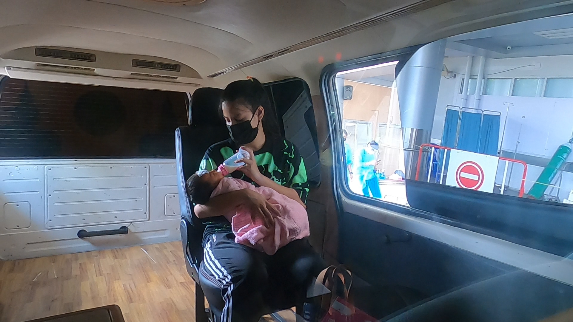 โดยช่วงเช้าตรู่รถกู้ชีพโดยกองทุนสวดเผาฟรี วัดไผ่ล้อม พร้อมเจ้าหน้าที่ ได้ออกไปรับ นางสาวธิญาภรณ์ กลีบกำไร หรือเอิร์นและน้องไอรินทร์ ลูกสาว แต่ไม่สามารถมาส่งตรงได้เนื่องจากยังไม่มีใบรับรองผลการตรวจหาเชื้อไวรัสโควิด-19 จึงต้องขับรถพาวนไปที่ โรงพยาบาลบ้านแพ้ว อ.บ้านแพ้ว จ.สมุทรสาคร เพื่อไปรับผลการตรวจก่อน และวนกลับมาที่โรงพยาบาลนครปฐม เพื่อจะมาส่งตัวแต่ปรากฏว่ายังไม่สามารถรับตัวแม่ลูกคู่นี้ไว้ได้ โดยทางเจ้าหน้าที่ได้แจ้งว่า ด.ญ.ไอรินทร์ นั้นใช้สิทธิประกันสังคมที่โรงพยาบาลบ้านแพ้ว ไม่สามารถรับตัวได้ ซึ่งทางเจ้าหน้าที่และหลวงพี่น้ำฝน ได้เร่งประสานงานกระทั่งทางโรงพยาบาลนครปฐม ได้รับตัวแม่และเด็กเข้าไปรอเตียง ในเวลา 10.30 น. ซึ่งด.ญ.ไอรินทร์ นั้นมีอาการตัวร้อนแดงมากขึ้นและยังไม่ได้ดูดนมตั้งตาเช้าตรู่