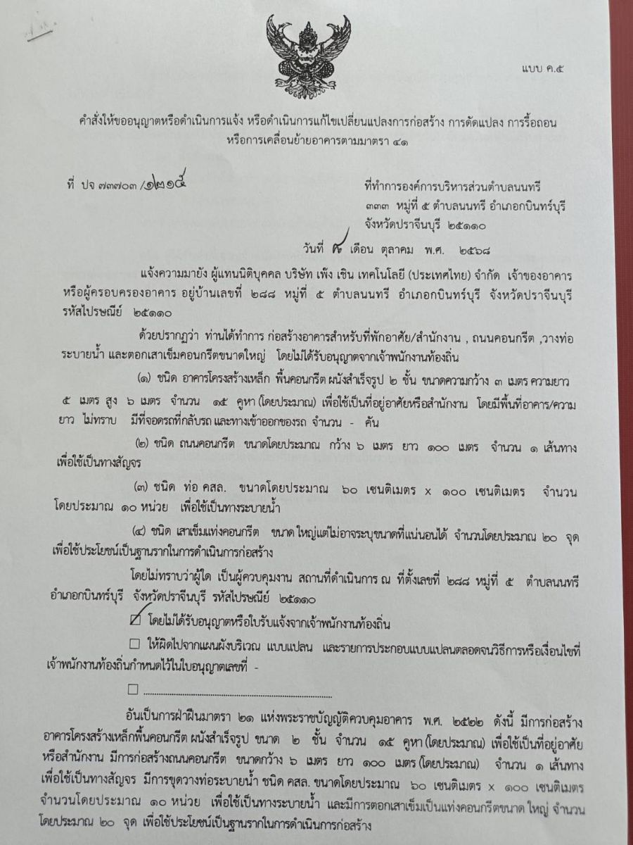 ปราจีนบุรี-เมื่อวันที่ 10 ต.ค.68 ผู้สื่อข่าวรายงานจาก จ.ปราจีนบุรี ได้รับแจ้งทางองค์การบริหารส่วนตำบลนนทรี (อบต.) อ.กบินทร์บุรี จ.ปราจีนบุรี ดืทำการติดป้ายระงับการก่อสร้างอาคารโรงงานของทุนจีนแห่งหนึ่ง (บริษัทเพ็ง เซิน เทคโนโลยี (ประเทศไทย) จำกัด ) ตั้งอยู่หมู่ที่ 5 ต.นนทรี อ.กบินทร์บุรี จ.ปราจีนบุรี