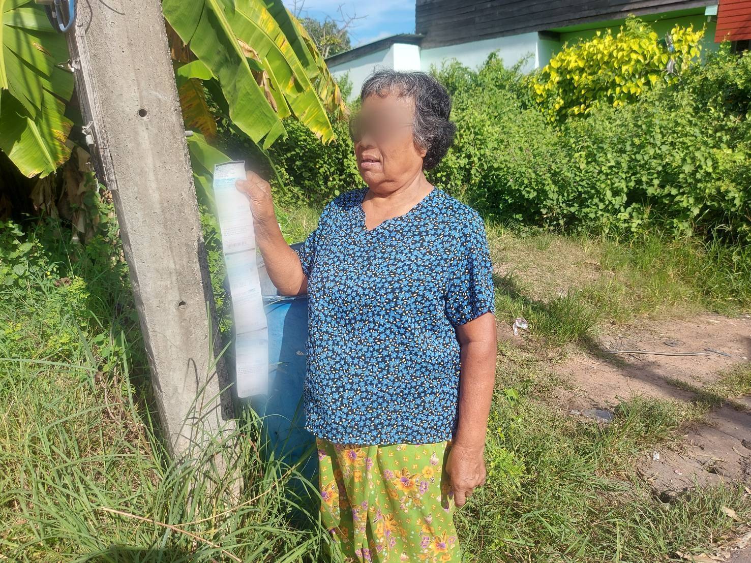 นางสาวกระจิก ทูลประโคน อายุ 75 ปี บ้านเลขที่ 8/3 ถนนชัยศิริ อ.ประโคนชัย จ.บุรีรัมย์ เล่าว่า ปกติจะเห็นพนักงานไฟฟ้าที่มาจดมิเตอร์ไฟฟ้าแล้วเอาบิลค่าไฟไปเสียบไว้ที่หน้าบ้านแต่ละหลังคาเรือน และหากยังไม่ไปจ่ายก็จะมีพนักงานมาออกใบเตือนอีกครั้ง