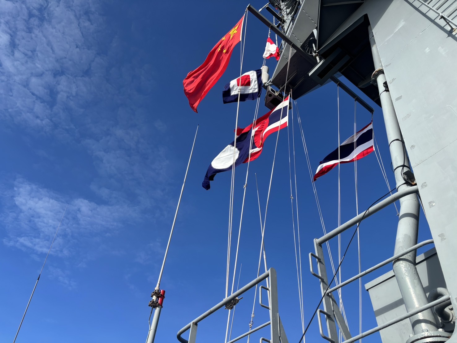 ชลบุรี-เมื่อ 16 ต.ค.68 กองเรือปฏิบัติการ ทัพเรือภาคที่ 1 จัดเรือหลวงประจวบคีรีขันธ์ ออกเรือพร้อมด้วยเฮลิคอปเตอร์ลำเลียงแบบที่ 4 (s-76B) แสดงกำลังต้อนรับหมู่เรือฝึกนักเรียนนายเรือ สาธารณรัฐประชาชนจีน จำนวน 2 ลำ ได้แก่ เรือ CNS QI JIGUANG(83) และเรือ CNS YIMENG SHAN (988) ในโอกาสที่เข้ามาเยือนประเทศไทย