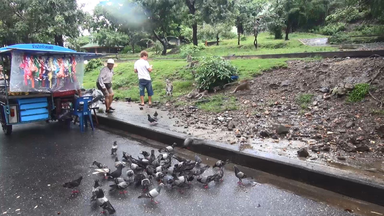 ในวันนี้มีนักท่องเที่ยวเดินทางพาครอบครัวมาท่องเที่ยวที่จังหวัดสงขลาซึ่งสามีเป็นชาวต่างชาติ มาซื้ออาหารให้ลิงกินทั้งกล้วย ข้าวโพดและถั่วอย่างเต็มที่ รวมทั้งซื้อให้นกพิราบกินด้วย