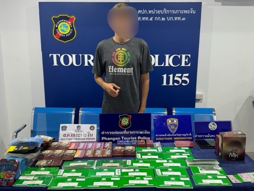 วันที่ 20 ตุลาคม 2568 ผู้สื่อข่าวรายงานว่า พ.ต.ท.วินิจ บุญชิต สว.ทท.5 กก.2 บก.ทท.3 สั่งการเจ้าหน้าที่ตำรวจท่องเที่ยว เกาะพะงัน พร้อมชุดสืบสวน (ส.ทท.5 กก.2 บก.ทท.3) ได้เข้าจับกุมชายชาวรัสเซียรายหนึ่ง ข้อหาประกอบธุรกิจและทำงานโดยไม่ได้รับอนุญาต พร้อมทั้งขยายผลตรวจค้นบ้านพัก พบยาเสพติดประเภท 5 (เห็ดขี้ควายแห้ง) และบุหรี่ไฟฟ้าบรรจุกัญชาจำนวนมาก ทั้งนี้ได้บูรณการร่วม หลายฝ่าย เช่น ตม.สุราษฏร์ธานี ฝ่ายปกครอง เกาะพะงัน สภ.เกาะพะงัน เข้าตรวจสอบ เจ้าหน้าที่ได้รับแจ้งจากสายลับว่ามีชายชาวรัสเซียเปิดร้านให้เช่ารถจักรยานยนต์และรถยนต์โดยไม่มีใบอนุญาตทำงาน ที่บริเวณบ้านมะเดื่อหวาน ริมถนนสายท้องศาลา-โฉลกหลำ อ.เกาะพะงัน จ.สุราษฎร์ธานี โดยมีลักษณะเป็นเพิงไม้ไผ่เจ้าหน้าที่ตำรวจจึงได้วางแผนล่อซื้อ โดยให้สายลับติดต่อขอเช่ารถยนต์ พร้อมลงบันทึกประจำวันธนบัตรล่อซื้อเป็นหลักฐาน