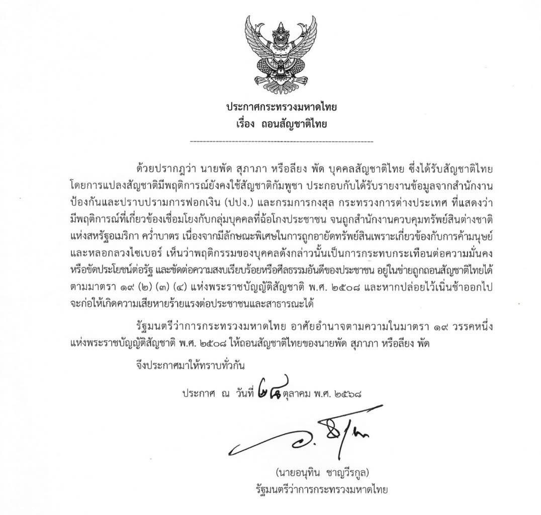 วันนี้ (24 ตุลาคม 2568) เวลา 12.50 น. วันนี้นายอนุทิน ชาญวีรกูล นายกรัฐมนตรีและรัฐมนตรีว่าการกระทรวงมหาดไทย ได้ลงนามในประกาศกระทรวงมหาดไทย เรื่อง ถอนสัญชาติ นายพัด สุภาภา หรือลียง พัด ซึ่งบุคคลดังกล่าว ได้รับสัญชาติไทย โดยการแปลงสัญชาติ แต่ยังมีพฤติการณ์ใช้สัญชาติกัมพูชา อีกทั้งมีรายงานข้อมูลจากสำนักงาน ปปง. และกรมการกงสุล กระทรวงการต่างประเทศว่า บุคคลข้างต้น มีพฤติการณ์ที่เกี่ยวข้องเชื่อมโยงกับกลุ่มบุคคลที่ฉ้อโกงประชาชน จนถูกสำนักงานควบคุมทรัพย์สินต่างชาติแห่งสหรัฐอเมริกา ดำเนินการคว่ำบาตรแล้ว เนื่องจากมีลักษณะพิเศษในการถูกอายัดทรัพย์สินเพราะเกี่ยวข้องกับการค้ามนุษย์ หลอกลวงไซเบอร์