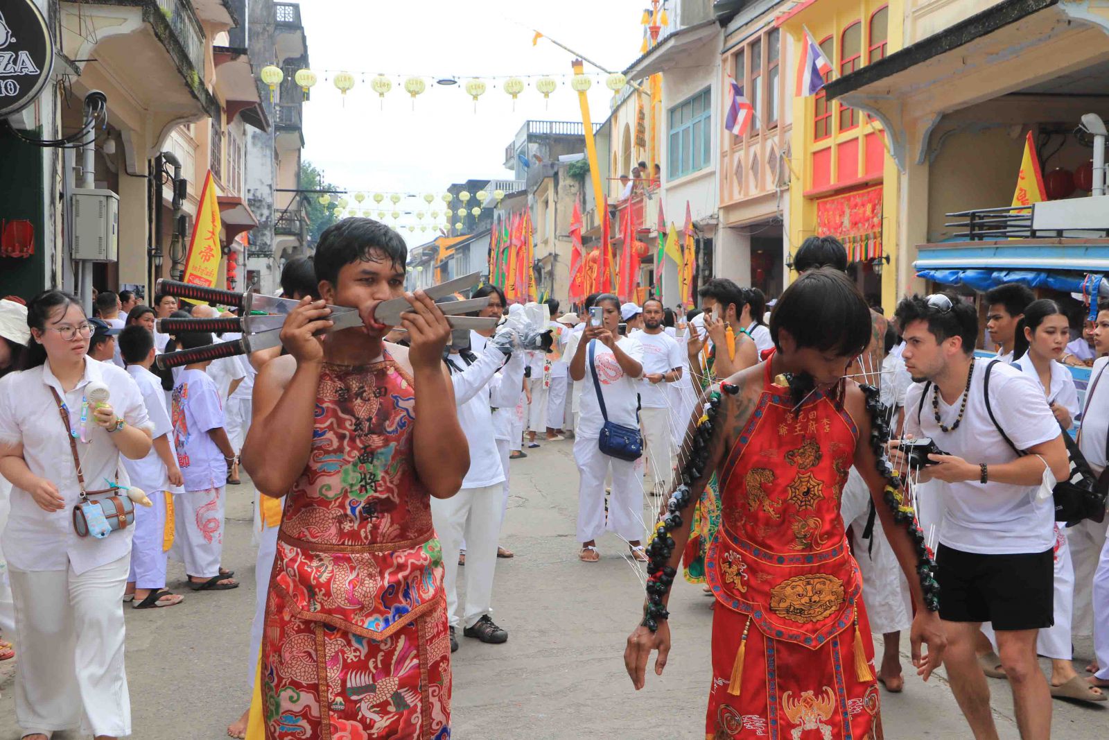 ขบวนแห่ยังประกอบด้วยเหล่า “ม้าทรง” ทั้งชายและหญิงหลายร้อยคน แสดงอิทธิฤทธิ์ด้วยการทรมานร่างกาย ใช้ของมีคมทิ่มแทงตามส่วนต่าง ๆ ของร่างกาย เพื่อรับเคราะห์แทนผู้ถือศีลกินผัก ตามความเชื่อดั้งเดิมของชาวจีนโพ้นทะเล