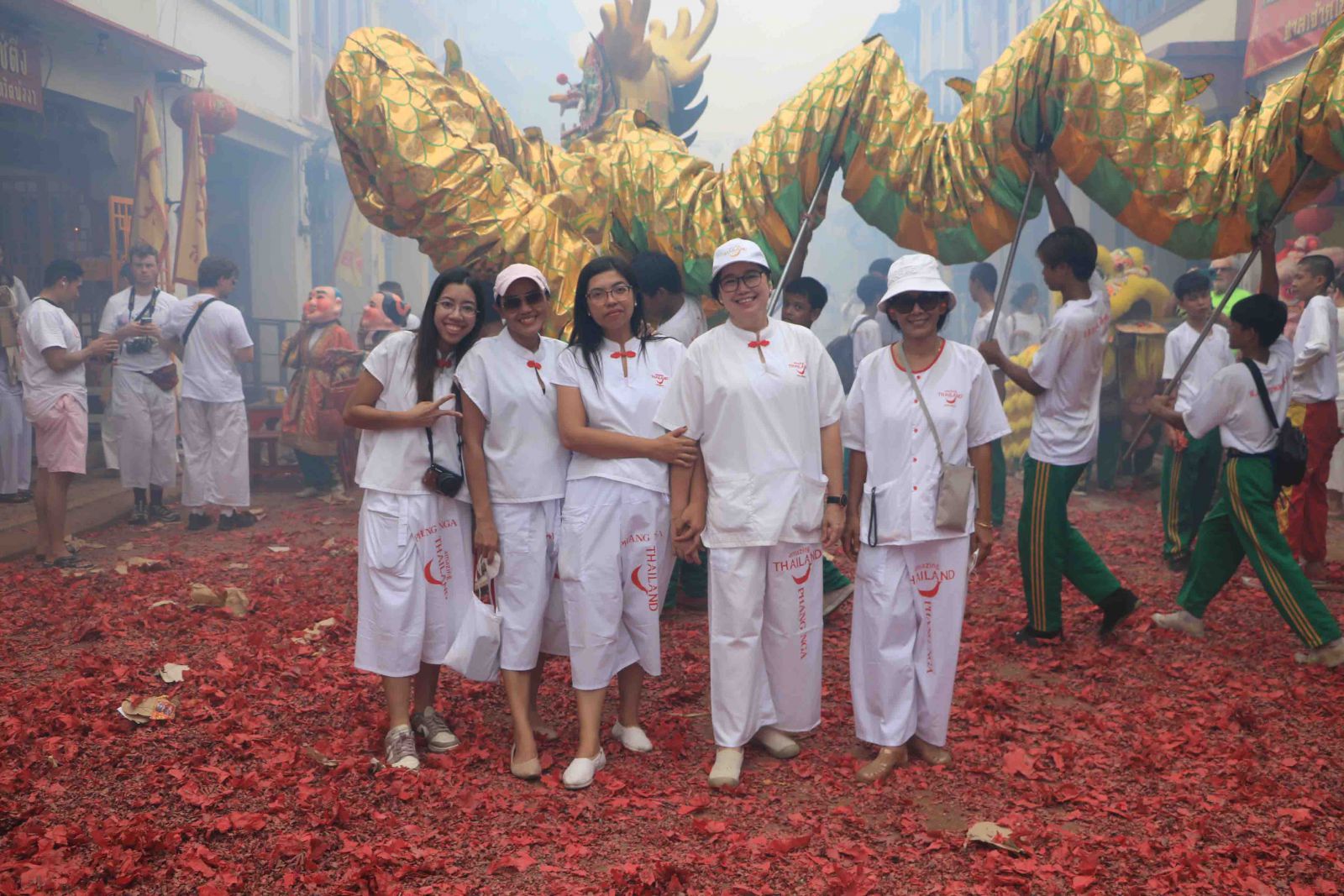 ไฮไลท์สำคัญของพิธี อยู่ที่บริเวณหน้าศาลเจ้าพ่อกวนอู (ซิ่นใช่ตึ๋ง)และหน้าศาลเจ้ากู่ไช่ตึ๋ง ซึ่งกลายเป็นจุดที่ผู้คนรอชมแน่นขนัด เสียงประทัดดังสนั่นราวกับฉากสงครามในภาพยนตร์ ชาวบ้านนับร้อยร่วมแรงกันโยนประทัดเข้าใส่ขบวนเกี้ยวอย่างต่อเนื่องไม่ขาดสายเสียงประทัดดังต่อเนื่องกว่า2ชั่วโมง คาดว่าปีนี้มีการจุดประทัดรวมกันมากกว่า 5 ล้านนัด หลังเสียงประทัดสงบลง เหล่าผู้หามเกี้ยวที่ทั้งตัวเต็มไปด้วยเขม่าควันและคราบประทัดเดินออกมาโดยปลอดภัย ซึ่งชาวบ้านเชื่อว่าเป็นเพราะ “ผู้ถือศีลอย่างเคร่งครัด” หรือที่เรียกว่า “เฉ้ง” จะได้รับการคุ้มครองจากสิ่งศักดิ์สิทธิ์ ขณะที่พื้นถนนที่ขบวนพระผ่าน กลายเป็นพรมสีแดงจากเศษประทัด-สัญลักษณ์แห่งความเป็นสิริมงคลที่ปกคลุมทั่วเมืองตะกั่วป่า