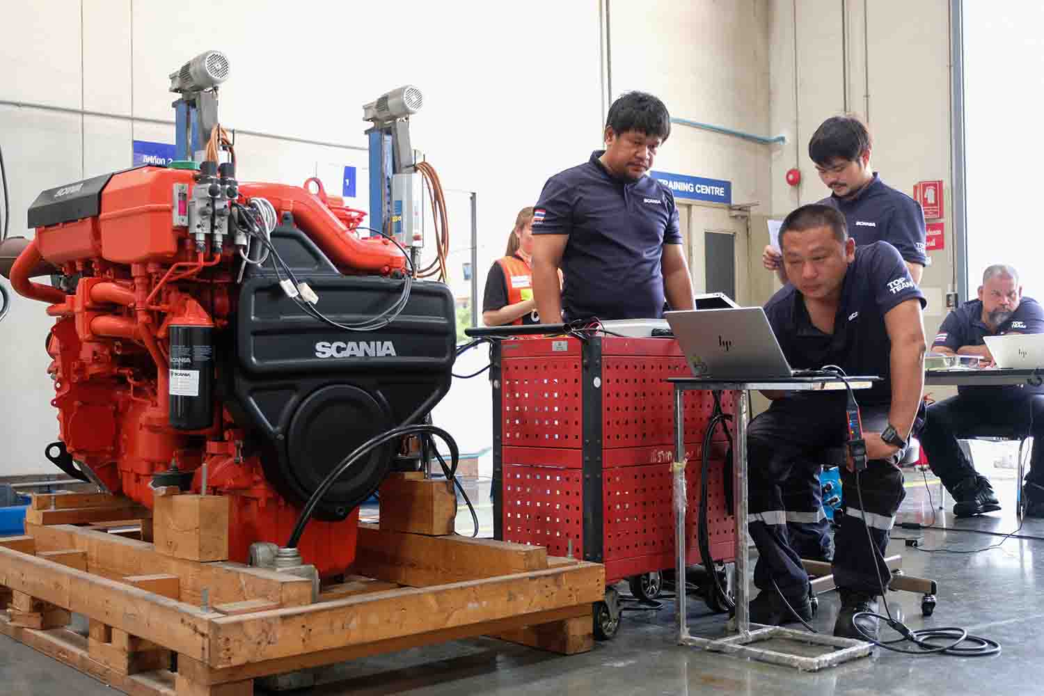 โดยนอกจากจะมีการพัฒนาและฝึกอบรมทีมช่างที่มีประสิทธิภาพแล้ว สแกนเนีย ยังจัดให้มีกิจกรรมการแข่งขัน Scania Top Team ขึ้นทุกๆ 2 ปี เพื่อค้นหาสุดยอดทีมช่างของ สแกนเนีย ในการเป็นตัวแทนของประเทศไปร่วมการแข่งขันบนเวที Scania Top Team ระดับภูมิภาคและระดับโลกที่ประเทศสวีเดน ซึ่งเป้าหมายของการแข่งขันก็เพื่อเป็นการกระตุ้นให้เกิดความตื่นตัวในการเรียนรู้ พัฒนาทักษะ แลกเปลี่ยนประสบการณ์ซึ่งกันและกันระหว่างทีมช่างของแต่ละประเทศ สำหรับการทดสอบในการแข่งขันนั้น จะมีทั้งภาคทฤษฎีและภาคปฏิบัติ การทำงานเป็นทีม และการแก้ปัญหาที่เกิดขึ้นจริง