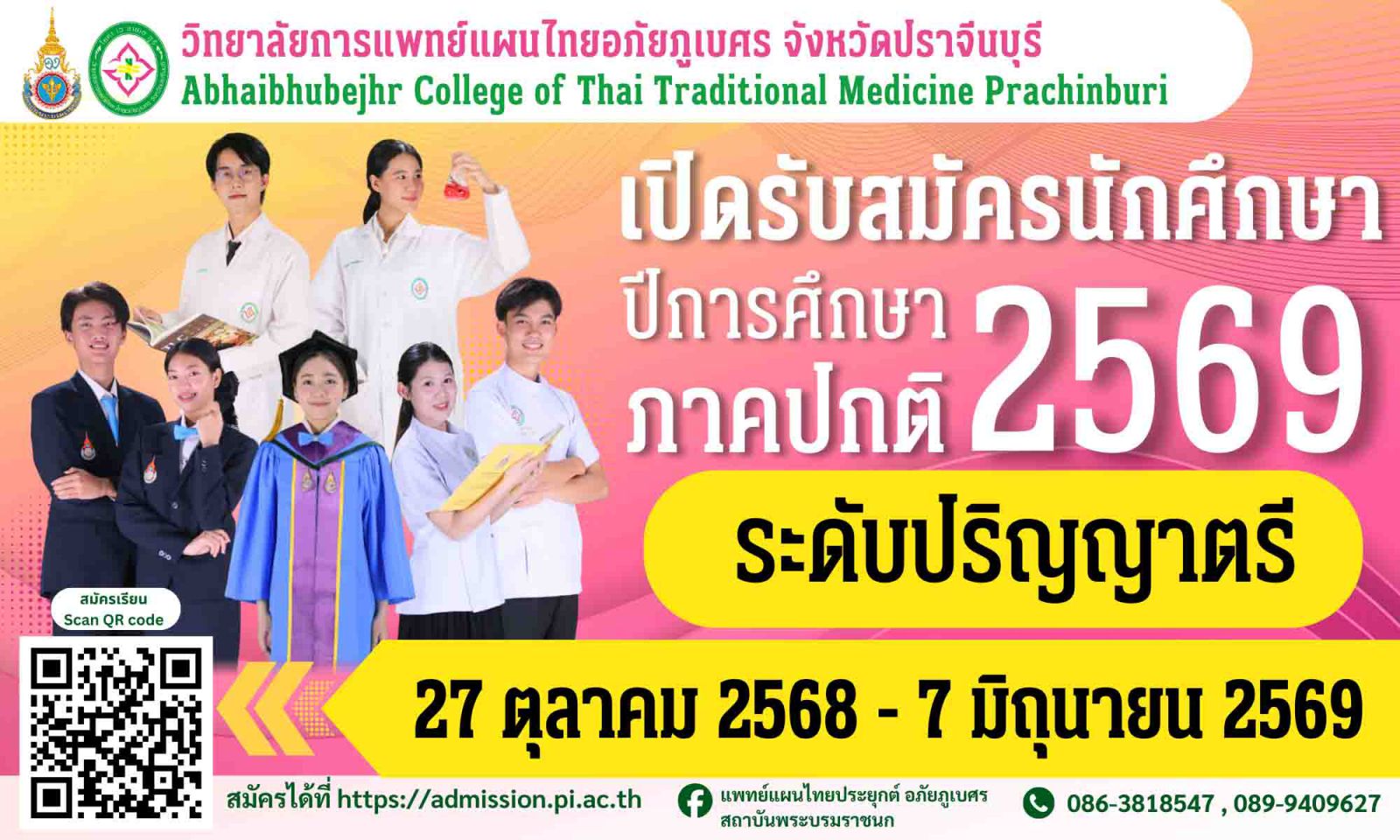 วิทยาลัยการแพทย์แผนไทยอภัยภูเบศร จังหวัดปราจีนบุรี เปิดรับสมัครนักศึกษาใหม่ ปีการศึกษา 2569 หลักสูตรการแพทย์แผนไทยประยุกต์บัณฑิต (พท.ป.บ.) / Bachelor of Applied Thai Traditional Medicine (B.A.T.M.) ระยะเวลาเรียน 4 ปี ตามแผนผลิตปกติและแผนผลิตโครงการผลิตแพทย์และทีมนวัตกรรมสุขภาพเพื่อเวชศาสตร์ครอบครัวตอบสนองต่อระบบสุขภาพปฐมภูมิทั่วไทย (9 หมอ) เพื่อสร้างโอกาสให้แก่นักเรียนในทุกพื้นที่ โดยเฉพาะในพื้นที่ห่างไกลได้เข้าศึกษาระดับอุดมศึกษาด้านวิทยาศาสตร์สุขภาพเพื่อตอบสนองความต้องการกำลังคนด้านสุขภาพของสถานบริการทั่วประเทศ รวมถึงการผลิตบัณฑิตคืนถิ่นจากชุมชนกลับไปปฏิบัติงานในระบบสุขภาพปฐมภูมิ ผู้สนใจ สามารถสมัครออนไลน์ที่ https://admission.pi.ac.th หรือสอบถามรายละเอียดได้ที่ โทร. 037-454-470 ต่อ 25, 089-904-9627, 081-381-8547Facebook: แพทย์แผนไทยประยุกต์ อภัยภูเบศร สถาบันพระบรมราชชนก อีเมล: education_service@acttm.ac.th