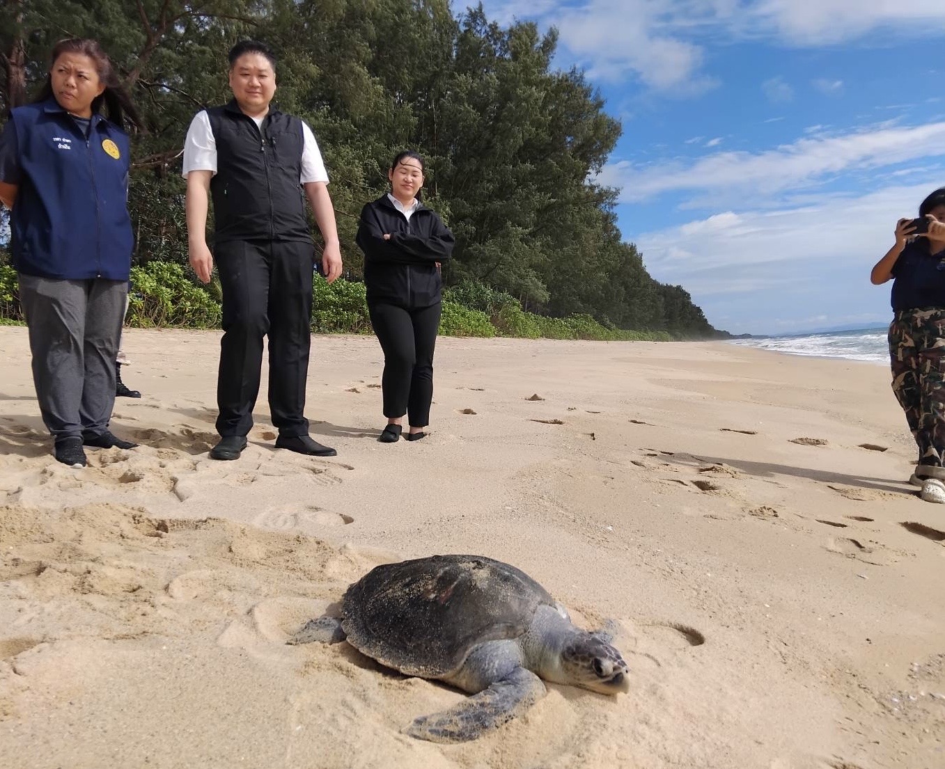 นอภ.ท้ายเหมืองร่วมอช.ปล่อยเต่าหญ้าคืน สู่หาดท้ายเหมืองหลังบาดเจ็บเกยตื้น