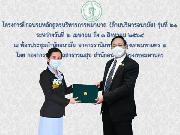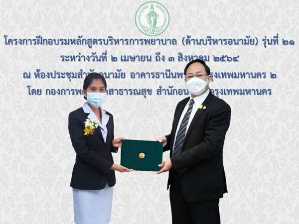 สำหรับผู้เข้ารับการฝึกอบรม ประกอบด้วยพยาบาลวิชาชีพศูนย์บริการสาธารณสุข และนักวิชาการพยาบาลสังกัดสำนักอนามัย จำนวน 26 คน และพยาบาลวิชาชีพโรงพยาบาลสังกัดสำนักการแพทย์ จำนวน 4 คน รวม 30 คน ดำเนินการฝึกอบรมระหว่างวันที่ 2 เม.ย. 64 - 3 ส.ค. 64 รวมเวลาตลอดหลักสูตร 48 วัน โดยปรับรูปแบบการฝึกอบรมเป็นออนไลน์ระบบทางไกลผ่านจอภาพ จากการประเมินผลการฝึกอบรมพบว่า ผู้เข้ารับการฝึกอบรมทุกคนเกิดการพัฒนาอย่างต่อเนื่องในความรู้ ความคิดสร้างสรรค์ และวิสัยทัศน์ในการจัดการงานบริการพยาบาลสาธารณสุข ที่สำคัญคือเกิดการสร้างสรรค์ผลงานได้บรรลุตามวัตถุประสงค์ และผ่านเกณฑ์การประเมินทั้งทางวิชาการและภาคปฏิบัติเกินร้อยละ 80 นอกจากนี้การฝึกอบรมหลักสูตรดังกล่าว ยังเป็นการสร้างผู้นำทางการพยาบาลที่มีคุณภาพ เพิ่มพูนความรู้ ทักษะ ความสามารถและประสบการณ์ในการบริหารจัดการบูรณาการพัฒนารูปแบบทางการพยาบาลให้ทันต่อสถานการณ์การเปลี่ยนแปลง สอดคล้องกับปัญหาและความต้องการทางด้านสุขภาพของประชาชน นำไปสู่คุณภาพชีวิตที่ดีตามนโยบายของกรุงเทพมหานคร