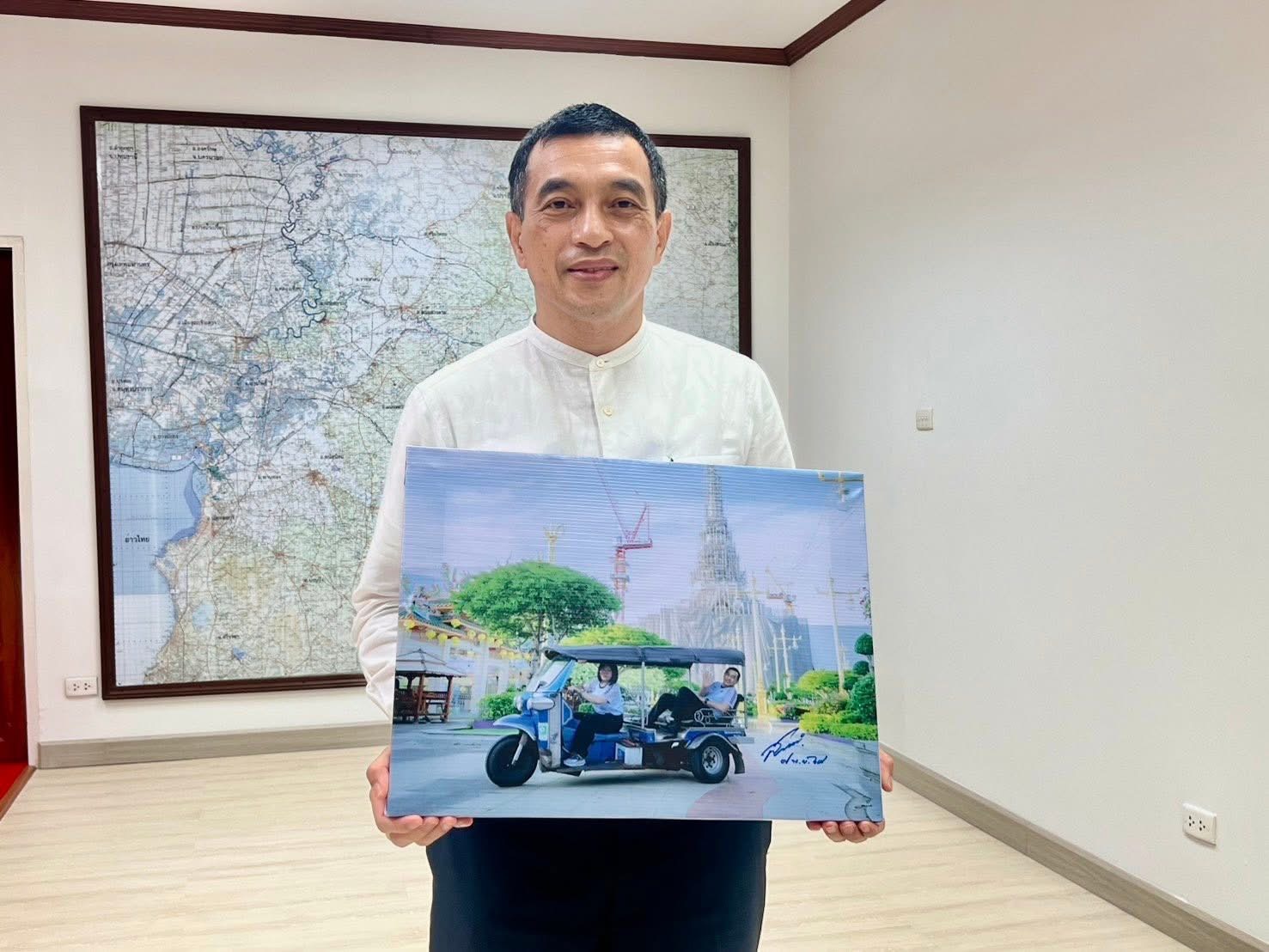 ฉะเชิงเทรา-ผู้ว่าพร้อมรองลงนามในภาพถ่ายมอบให้ลุงขับตุ๊กตุ๊ก หลังจากการจัดกิจกรรมจังหวัดฉะเชิงเทรา วิ่งไปเที่ยวไปกับแม่บ้านมหาดไทย นายสันติ รังษิรุจิ ผู้ว่าราชการจังหวัดฉะเชิงเทรา รู้สึกประทับใจกับลุงผู้ขับรถตุ๊กๆพานั่งเที่ยวชมเมืองแปดริ้วจึงพร้อมด้วยนางสาวฉัตรประอร นิยม รองผู้ว่าราชการจังหวัดฉะเชิงเทรา มอบลงนามในภาพถ่ายที่จัดทำขึ้นเพื่อเป็นของที่ระลึกมอบให้กับ นายสมคิด ทิพย์พิทักษ์ หรือ “ลุงสมคิด” เจ้าของรถตุ๊กตุ๊กเพื่อแสดงความขอบคุณในความร่วมมือและน้ำใจไมตรี ที่ได้ร่วมสนับสนุนกิจกรรม “วิ่งไป เที่ยวไป กับแม่บ้านมหาดไทย จังหวัดฉะเชิงเทรา”