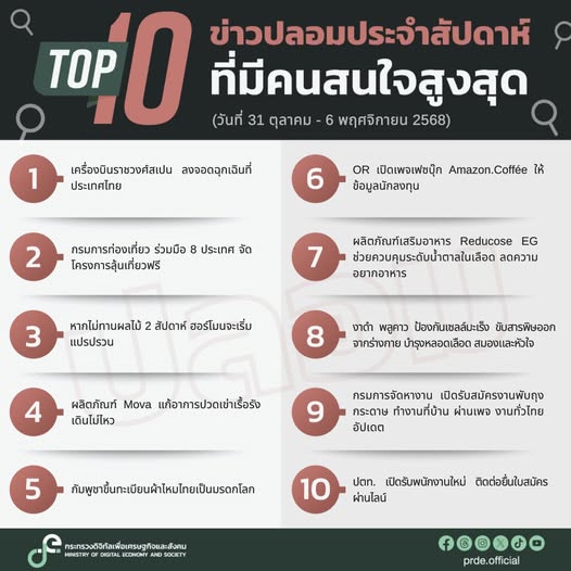 นางสาวสุชาดา กล่าวต่อว่า เมื่อพิจารณาจากข่าวปลอมที่ได้รับความสนใจในลำดับต้นๆ ในสัปดาห์นี้ส่วนใหญ่เป็นข่าวเกี่ยวกับความมั่นคงระหว่างประเทศ ข่าวนโยบายรัฐบาล และการให้บริการของหน่วยงานรัฐ ข่าวที่เกี่ยวข้องกับผลิตภัณฑ์สุขภาพ ซึ่งทั้งหมดมีผลกระทบต่อสังคมส่วนใหญ่ อาจทำให้เกิดความเข้าใจผิด สับสน ตื่นตระหนก และวิตกกังวลได้ รวมทั้งอาจทำให้สูญเสียทรัพย์สิน หรือ ข้อมูลส่วนบุคคล โดยข่าวที่ได้รับความสนใจจากประชาชนมากที่สุด 10 อันดับ ได้แก่