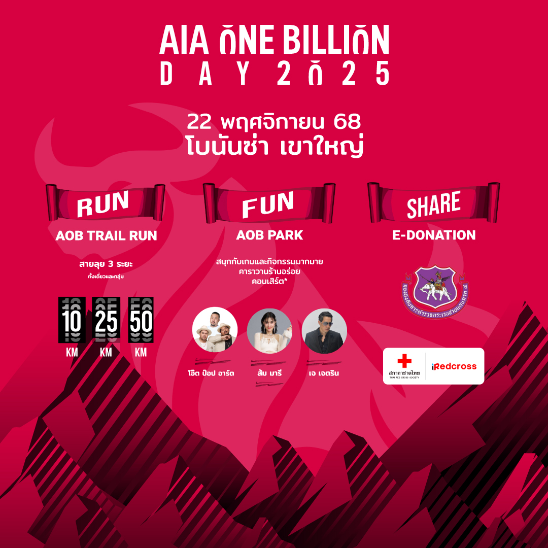 กรุงเทพฯ-เอไอเอ ประเทศไทย ผนึกกำลัง กลุ่มบริษัทพราว, จังหวัดนครราชสีมา และมหาวิทยาลัยราชภัฏนครราชสีมา เชิญชวนคนไทยทุกเพศทุกวัยร่วมเป็นส่วนหนึ่งของกิจกรรม “เอไอเอ วัน บิลเลียน เดย์ 2025” (AIA ONE BILLION DAY 2025) กิจกรรมวิ่งเทรลระดับชาติบนเส้นทางมรดกโลก ณ อุทยานแห่งชาติเขาใหญ่ จังหวัดนครราชสีมา ในวันเสาร์ที่ 22 พฤศจิกายน 2568 ภายใต้แนวคิด “Rethink Healthy – วิ่งในแบบที่เป็นคุณ เพื่อสุขภาพและชีวิตที่ดีขึ้นอย่างยั่งยืน”