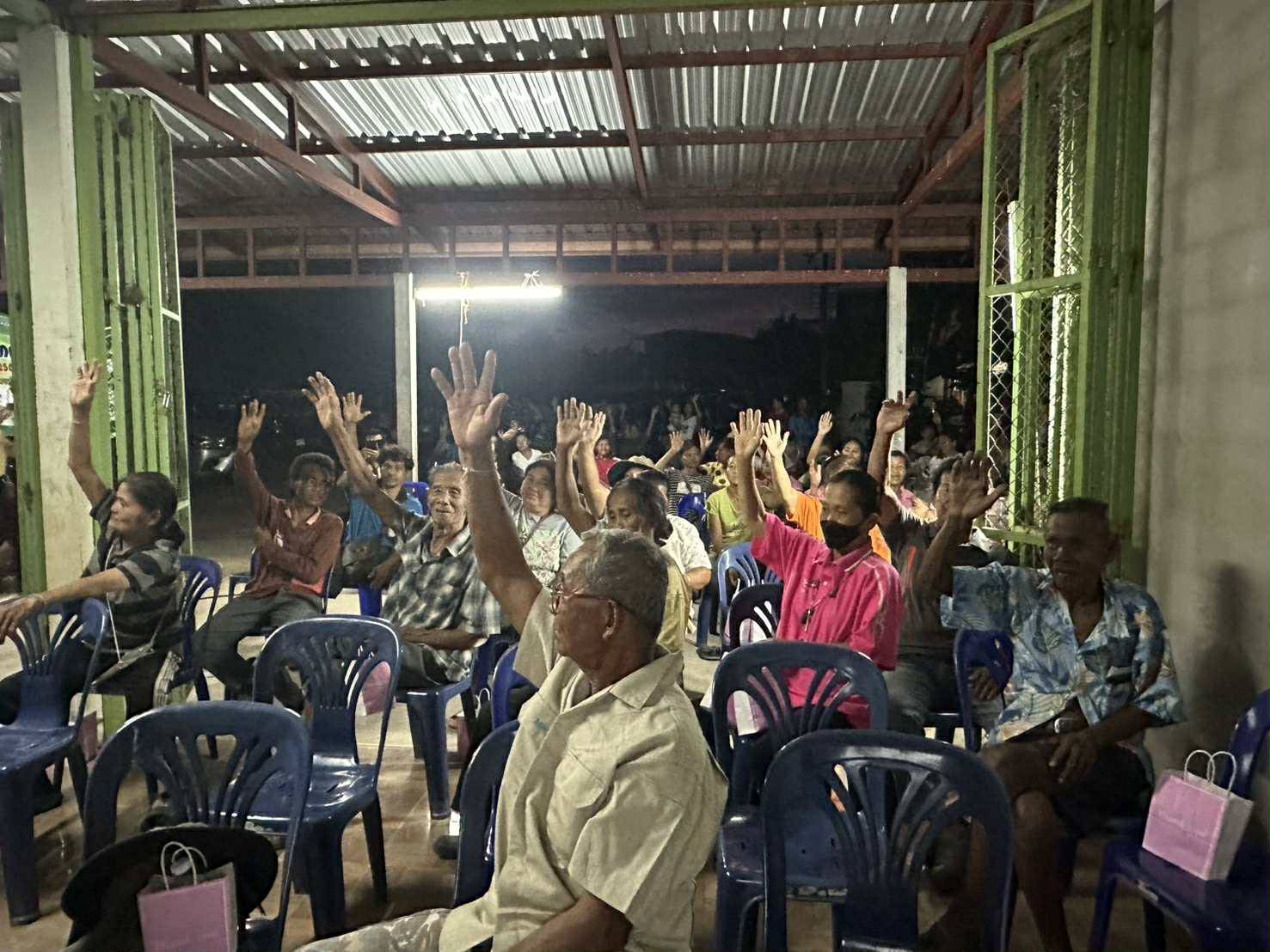 ด้าน น.ส.ปวีณา อ้อชัยภูมิ หนึ่งในชาวบ้านได้เผยว่าที่ผ่านมาทางชุมชนได้มีการทำประชาคมในหมู่บ้านและได้มีการยกมือผ่านประชาคมจากชาวบ้านในหมู่บ้านตลาดแร้งมาแล้ว ทั้งนี้ทางผู้ที่จะดำเนินการก่อสร้างยังได้มีการนำชาวบ้านไปศึกษาดูงานจากฟาร์มจริงในระปิดมาแล้ว ซึ่งทุกคนมองเห็นประโยชน์จากการสร้างฟาร์มในครั้งนี้ ที่ชาวบ้านจะได้รับประโยชน์ในด้านของการพัฒนาต่างๆในชุมชนเช่น การถนนหนทาง ไฟฟ้าส่องสว่าง รวมสิ่งอำนวยความสะดวกและสาธารณะประโยชน์ต่างๆ และก่อให้เกิดการจ้างงานในพื้นที่ ซึ่งชาวจะได้รับ สำหรับในการทำประชาคมนั้นก็ได้มีการบันทึกข้อตกลงร่วมกันในชุมชนตามที่ชาวบ้านเรียกร้องไปให้มีการพัฒนาต่างๆที่จะเกิดขึ้นในชุมชนได้ อย่างต่อเนื่อง ซึ่งทางผู้ที่จะเข้ามาดำเนินการก่อสร้างก็ยินดีที่จะปฏิบัติตามข้อเรียกร้องของคนในชุมชน ทั้งนี้ชาวบ้านที่มาในครั้งนี้ ยังได้มอบกระเช้าและผูกผ้าขมาเพื่อเป็นขวัญกำลังใจให้กับนายกเทศมนตรี ครั้งนี้ด้วย