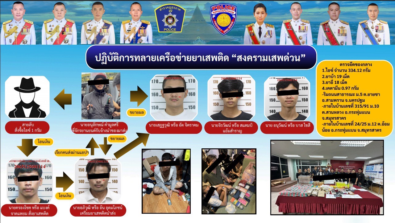 นาย อนุวัฒน์ หรือ บาส ไขสี อายุ 24 ปีอยู่บ้านเลขที่ 88/84 หมู่ที่ 7 ตำบลสวนหลวง อำเภอกระทุ่มแบน จังหวัดสมุทรสาคร นาย จิรวัฒน์ หรือ สแตมป์ แย้มสำราญ อายุ 23 ปี อยู่บ้านเลขที่ 11/23 ซอยมาเจริญ 1 แยก 1 ตำบลหนองค้างพลู อำเภอเขตหนองแขม จังหวัดกรุงเทพมหานคร และนาย ครองโชค หรือ แบงค์ จาดแหยม อายุ 40 ปี อยู่บ้านเลขที่ 59 หมู่ที่ 2 ตำบลกาหลง อำเภอเมือง จังหวัดสมุทรสาคร พร้อมของกลาง ยาไอซ์ จำนวน 1.0 กรัม ซุกซ่อนอยู่ในห่อกระดาษทิชชู่เปียก และถูกผนึกไว้ด้วยกล่องกระดาษสีน้ำตาล บรรจุอยู่ในถุงกระดาษสีเขียว เป็นไอซ์ ที่เจ้าหน้าที่ตำรวจตรวจยึดได้จากพนักงานส่งพัสดุ LALAMOVE ซึ่งจะนำส่งให้กับสายลับที่สั่งซื้อไว้ (ของกลางจากการล่อซื้อ) ยาไอซ์ จำนวน 1.0 กรัม ซุกซ่อนอยู่ในห่อกระดาษทิชชู่เปียก และถูกผนึกไว้ด้วยกล่องกระดาษสีน้ำตาล บรรจุอยู่ในถุงกระดาษสีน้ำตาล (เป็นไอซ์ ที่เจ้าหน้าที่ตำรวจตรวจยึดได้ จากนายจิรวัฒน์ แย้มสำราญ ขณะจะนำพัสดุไปวางส่งให้กับพนักงานส่งพัสดุ LALAMOVE ซึ่งจะนำส่งให้กับสายลับที่สั่งซื้อไว้ (ของกลางจากการล่อซื้อครั้งที่ 2 ) ยาเสพติดที่ตรวจยึดได้จากบ้านเลขที่ 315/91 หมู่ที่ 10 ต.สวนหลวง อ.กระทุ่มแบน จว.สมุทรสาคร ไอซ์ น้ำหนักรวมประมาณ 332 กรัม ยาบ้า จำนวน 19 เม็ด ยาอี จำนวน 18 เม็ด เคตามีน น้ำหนักรวมประมาณ 0.97 กรัม อุปกรณ์การสื่อสาร ประกอบด้วยโทรศัพท์ จำนวน 5 เครื่อง อุปกรณ์สำหรับแบ่งบรรจุและการแพ็คพัสดุปิดผนึก ส่งให้กับผู้บริการขนส่งสินค้า LALAMOVE ประกอบด้วย ห่อกระดาษทิชชู่เปียก ห่อสีเขียวชมพู จำนวน 200 ห่อ กล่องกระดาษสีน้ำตาล สำหรับใช้บรรจุพัสดุ จำนวน 656 ใบ ถุงซิปล็อก ขนาด 3 × 5 สำหรับใช้แบ่งบรรจุยาเสพติด จำนวน 2,700 ใบ ถุงพลาสติกเปิดปิดหัว สำหรับแบ่งบรรจุยาเสพติด จำนวน 4,000 ใบเทปกาวใส สำหรับใช้ผนึกกล่องกระดาษ จำนวน 2 ม้วน เครื่องปริ๊นท์บาร์โค้ด จำนวน 1 เครื่องกระดาษสำหรับปริ้น จำนวน 9 ม้วน ถุงแพ็คกล่องพัสดุ จำนวน 318 ใบ ถุงกระดาษชนิดหูหิ้ว จำนวน 300 ใบ สติ๊กเกอร์แปะหน้ากล่องพัสดุ จำนวน 2 ม้วน เครื่องชั่งดิจิตอล จำนวน 1 เครื่องสมุดจดบัญชีรายชื่อผู้สั่งซื้อยาเสพติด จำนวน 3 เล่ม พร้อมตรวจยึดทรัพย์สินที่เกี่ยวกับยาเสพติดตามพรบ.มาตรการฯ รถยนต์โตโยต้า รุ่น วีออส สีเทา จำนวน 1 คัน รถจักรยานยนต์ จำนวน 4 คัน