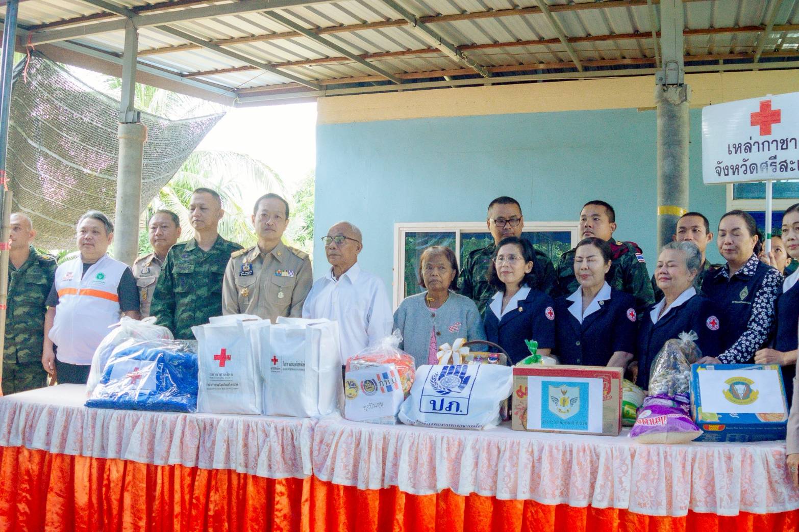 โอกาสนี้ สำนักงานเหล่ากาชาดจังหวัดศรีสะเกษ ได้มอบถุงกาชาด พร้อมเงินสดจำนวน 2,000 บาท ร่วมกับสำนักงาน ปภ. จ.ศรีสะเกษ มอบกระเช้าเครื่องดื่มเพื่อสุขภาพและผ้าห่มกันหนาว ส่วนกองพันทหารราบที่ 13 มอบข้าวสารและอาหารแห้ง และสำนักงานพัฒนาชุมชนอำเภอ ได้มอบเครื่องอุปโภค-บริโภค จำนวนหนึ่งอีกด้วย.