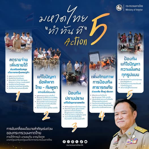 วันนี้ (21 พ.ย. 68) นายอรรษิษฐ์ สัมพันธรัตน์ ปลัดกระทรวงมหาดไทย เปิดเผยถึงการขับเคลื่อนภารกิจสำคัญของกระทรวงมหาดไทยตามนโยบายของนายอนุทิน ชาญวีรกูล นายกรัฐมนตรีและรัฐมนตรีว่าการกระทรวงมหาดไทย โดยมุ่งบำบัดทุกข์ บำรุงสุข ทำให้ประชาชนมีความสมบูรณ์พูนสุขโดยถ้วนหน้า ด้วยความทันโลก ทันสมัย ทันเหตุการณ์ ทันท่วงที ผ่าน 5 นโยบายสำคัญ “มหาดไทย ทำ ทัน ที Action 5”