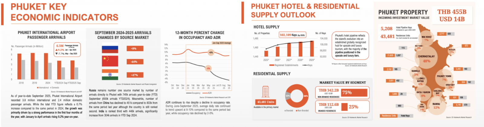 ในด้านอสังหาริมทรัพย์ ปัจจุบันมีที่อยู่อาศัยตลาด primary 43,481 ยูนิต และจะมีโรงแรมใหม่อีก 5,208 ห้อง เปิดตั้งแต่ปี 2569–2572 ทำให้จำนวนห้องพักรวมเพิ่มเป็น 102,109 ห้องภายใน 4 ปี สะท้อนให้เห็นว่า ภูเก็ตกำลังก้าวขึ้นเป็นจุดหมายปลายทางด้านไลฟ์สไตล์ระดับลักชูรีและการลงทุนที่โดดเด่นของเอเชีย