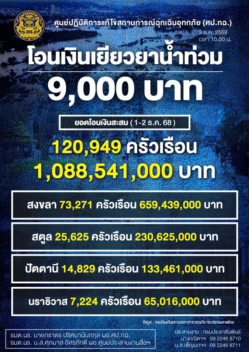 นางสาวรัชดาฯ กล่าวว่า วันที่ 2 ธันวาคม 2568 ได้โอนเงินเข้าไปยังบัญชีประชาชน 120,949 ครัวเรือน คิดเป็นเงิน 1,088 ล้านบาท มีอีก 2,878 ครัวเรือน ที่โอนไม่สำเร็จเพราะที่ไม่ได้ผูกบัญชีพร้อมเพย์ และขอย้ำว่าเมื่อประชาชนดำเนินการผูกกับพร้อมเพย์แล้ว ทางธนาคารออมสินจะดำเนินการโอนเงินเข้าบัญชีทันที สำหรับวันนี้ (3 ธันวาคม 2568 ปภ.จะโอนเงินให้อีก 66,187 ครัวเรือน คิดเป็นวงเงิน 595,683,000 บาท ใน 4 จังหวัด 1) สงขลา จำนวน 46,976 ครัวเรือน 2) ปัตตานี จำนวน 16,953 ครัวเรือน 3) สุราษฎร์ธานี จำนวน 1,997 ครัวเรือน 4) ยะลา จำนวน 261 ครัวเรือน