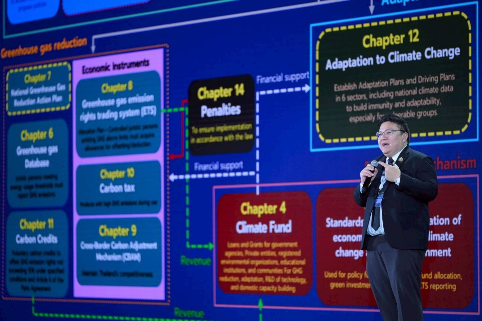 ดร.กิตติศักดิ์ พฤกษ์กานนท์ผู้แทนกรมการเปลี่ยนแปลงสภาพภูมิอากาศและสิ่งแวดล้อม กล่าวว่า “สถานการณ์ปัจจุบันและแนวโน้มการดำเนินงานระดับโลก ยุทธศาสตร์และทิศทางนโยบายสำคัญของประเทศไทยที่จะเป็นการแก้ไขปัญหาเร่งด่วน ผลักดันการดำเนินงานเพื่อการพัฒนาที่ยั่งยืน การรับมือกับการเปลี่ยนแปลงสภาพภูมิอากาศ (Climate Action) การผลักดันการดำเนินงานเพื่อรองรับการเปลี่ยนแปลงสภาพภูมิอากาศ ทั้งในด้านการลดก๊าซเรือนกระจก (Mitigation) และการปรับตัวต่อการเปลี่ยนแปลงสภาพภูมิอากาศ (Adaptation) รวมทั้งการพัฒนาและดำเนินมาตรการ กลไก/เครื่องมือที่จำเป็น เพื่อขับเคลื่อนการดำเนินงานจากนโยบายไปสู่การปฏิบัติอย่างเป็นรูปธรรม เช่น การตรา พระราชบัญญัติการเปลี่ยนแปลงสภาพภูมิอากาศ พ.ศ. ... และกฎหมายลำดับรอง การจัดตั้งกองทุนภูมิอากาศ (Climate Fund) เพื่อให้การดำเนินงานสามารถสะท้อนเทคโนโลยีใหม่และสถานการณ์เศรษฐกิจ-สังคมที่เปลี่ยนไปอย่างต่อเนื่องปัจจุบันกรมฯ อยู่ระหว่างปรับปรุงแผนแม่บทรองรับการเปลี่ยนแปลงสภาพภูมิอากาศ การจัดทำแผนระยะสั้นที่สอดคล้องกับยุทธศาสตร์ระยะยาวในการพัฒนาแบบปล่อยก๊าซเรือนกระจกต่ำของประเทศ (Thailand’s Long-Term Low Greenhouse Gas Emission Development Strategy : LT-LEDS) การพัฒนาระบบติดตามและประเมินผลการส่งเสริมองค์ความรู้ การวิจัย นวัตกรรม และการพัฒนาขีดความสามารถ ตลอดจนการสื่อสารและสร้างการมีส่วนร่วมกับทุกภาคส่วน และมีแผนจะดำเนินโครงการศึกษาแนวทางการเปลี่ยนผ่านอย่างเป็นธรรม (Just Transition) สำหรับการพัฒนาเศรษฐกิจคาร์บอนต่ำ และผลักดันสังคมคาร์บอนต่ำของประเทศไทยต่อไป”