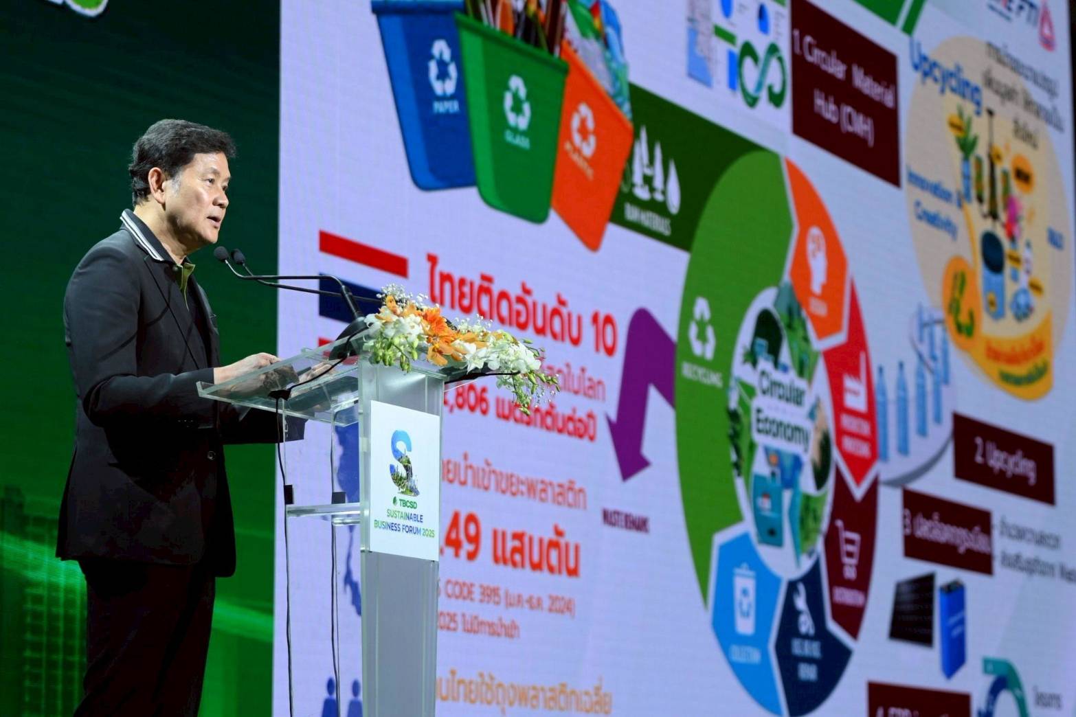 ดร.วิจารย์ สิมาฉายา ผู้อำนวยการสถาบันสิ่งแวดล้อมไทย และเลขาธิการองค์กรธุรกิจเพื่อการพัฒนาอย่างยั่งยืนกล่าวว่า “ปัจจุบันประเทศไทยและประเทศต่าง ๆ ทั่วโลกกำลังเผชิญกับวิกฤตปัญหาด้านสิ่งแวดล้อมโลก 3 ประการ ได้แก่การเปลี่ยนแปลงสภาพภูมิอากาศ การสูญเสียความหลากหลายทางชีวภาพ และมลพิษ ซึ่งล้วนมีความเชื่อมโยงกันในทุกมิติ หนึ่งในปัญหาด้านสิ่งแวดล้อมที่มีความท้าทายทั้งในระดับประเทศ ระดับภูมิภาค และระดับโลกในการหาแนวทางป้องกันและแก้ไขปัญหาอย่างยั่งยืน ได้แก่ ปัญหามลพิษทางอากาศจาก PM2.5 ปัญหามลพิษขยะและขยะพลาสติก โดยปัจจุบันภาคธุรกิจไทยได้มีการบูรณาการความร่วมมือกับภาคีทุกภาคส่วนในการร่วมแก้ไขปัญหาขยะและการจัดการขยะพลาสติกทั้งในเชิงระดับนโยบายและการปฏิบัติในพื้นที่เพื่อสร้างระบบนิเวศเศรษฐกิจหมุนเวียน (Circularity Ecosystem)ในการจัดการปัญหาขยะพลาสติกและขยะอื่น ๆ อย่างเป็นรูปธรรมบนพื้นฐานของการใช้ทรัพยากรธรรมชาติอย่างสมดุลตามหลักการเศรษฐกิจหมุนเวียนอันเป็นการแสดงถึงความมุ่งมั่นในการสร้างระบบนิเวศที่เอื้อต่อการหมุนเวียนวัสดุและการจัดการขยะอย่างยั่งยืน โดยมีเป้าหมายในการลดปริมาณขยะ เพิ่มอัตราการรีไซเคิล และสร้างมูลค่าเพิ่มจากวัสดุใช้แล้วเพื่อให้เกิดคุณค่าทางเศรษฐกิจ การเพิ่มความสามารถในการแข่งขันและการเติบโตทางเศรษฐกิจของประเทศไทย”