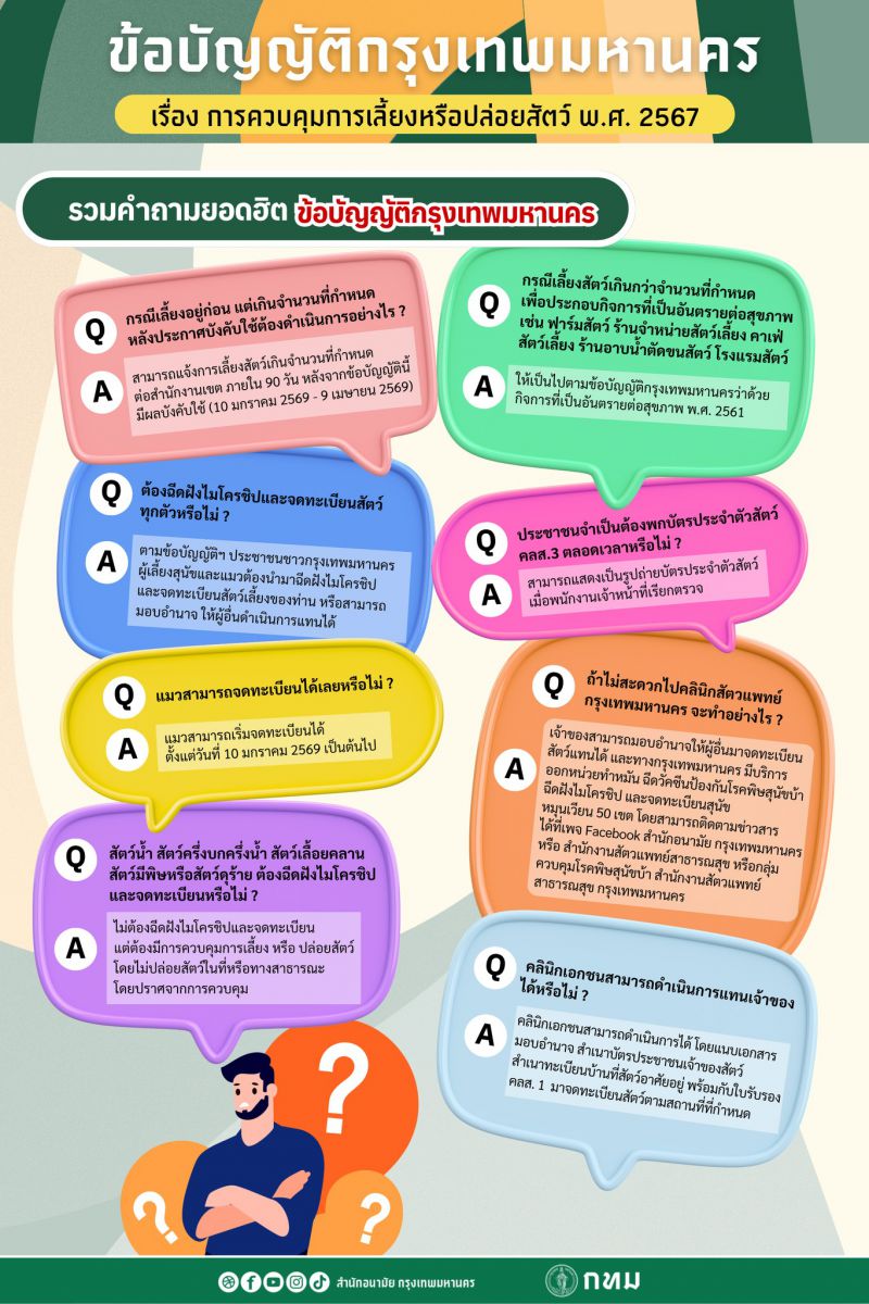สำหรับกรณีข้อกังวลเรื่องการกำหนดขนาดพื้นที่สัตว์เลี้ยง สนอ. ได้ประชาสัมพันธ์และเผยแพร่ข้อมูลข่าวสารเกี่ยวกับการเลี้ยงสัตว์อย่างรับผิดชอบ ประโยชน์ของการฝังไมโครชิป การจดทะเบียนสุนัขและแมว รวมถึงการบังคับใช้ข้อบัญญัติดังกล่าวจะไม่มีผลย้อนหลังกับผู้ที่เลี้ยงสัตว์อยู่แล้ว โดยเผยแพร่ผ่านสื่อออนไลน์หลายรูปแบบ อาทิ ภาพ อินโฟกราฟิก คลิปวิดีโอ TikTok แผ่นพับให้ความรู้ และช่องทางเฟซบุ๊กของกลุ่มควบคุมโรคพิษสุนัขบ้า ศูนย์บริการสาธารณสุขทั้ง 69 แห่ง สนอ. และสำนักงานเขตทั้ง 50 เขต ซึ่งเป็นเครือข่ายการสื่อสารข้อมูลสำคัญของ กทม.