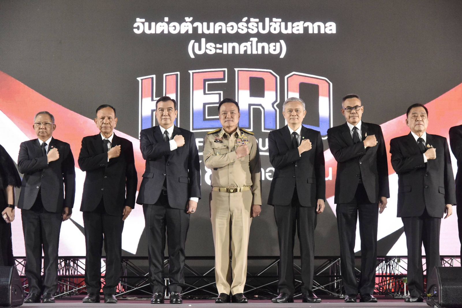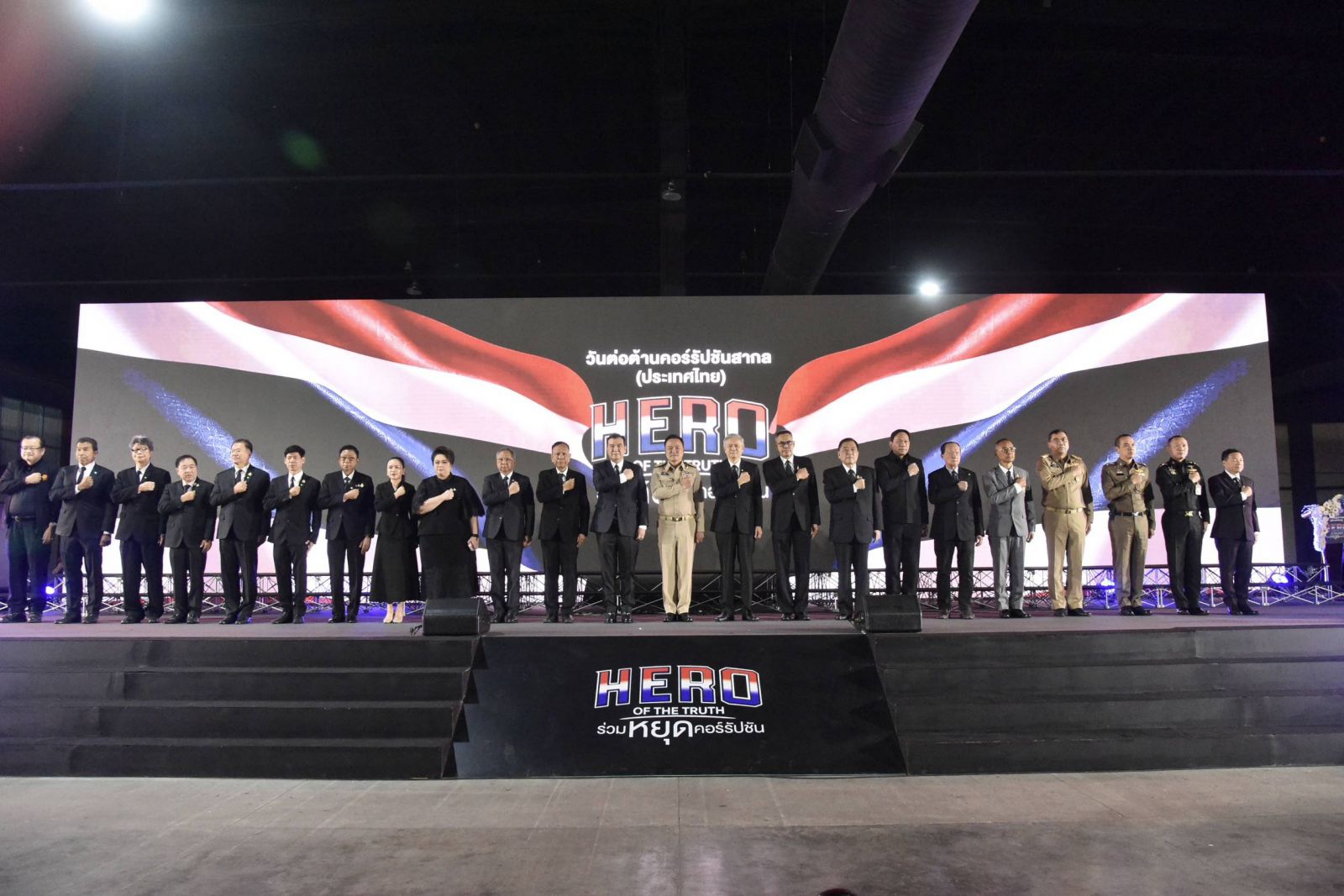 จากนั้น นายกรัฐมนตรีแสดงสัญลักษณ์ต่อต้านการทุจริต โดยการเปิดผ้าคลุมสัญลักษณ์ “HERO OF THE TRUTH ร่วมหยุดคอร์รัปชัน” เพื่อเป็นการแสดงเจตนารมณ์อย่างแน่วแน่ของทุกหน่วยงานในการต่อต้านการทุจริตคอร์รัปชันไม่ว่าจะเป็นในรูปแบบใด