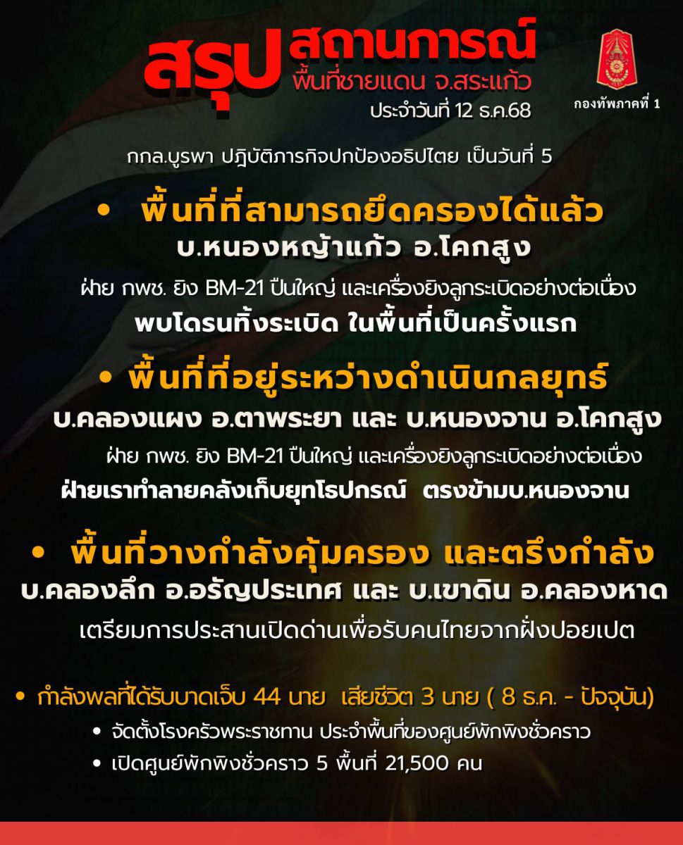 ในส่วนกำลังพลที่ได้รับบาดเจ็บจากสถานการณ์ที่เกิดขึ้น โดยวันนี้มีรายงานผู้ได้รับบาดเจ็บ เพิ่มเติมจำนวน 2 นาย สรุปยอดกำลังพลได้รับบาดเจ็บและเสียชีวิต ตั้งแต่ 8 ธ.ค.68 - ปัจจุบัน บาดเจ็บ 50 นาย และเสียชีวิต 3 นาย ประชาชนในพื้นที่ชายแดน จ.สระแก้ว ใน 4 อำเภอ ทางจังหวัดสระแก้วร่วมกับส่วนราชการที่เกี่ยวข้อง ได้เปิดศูนย์พักพิงชั่วคราว 5 พื้นที่ จำนวน 44 ศูนย์ รวม 21,883 คน
