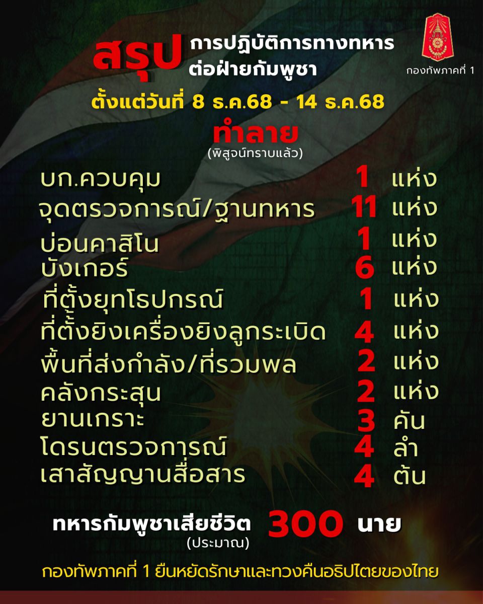 ทั้งนี้ กกล.บูรพา ได้ปฏิบัติการทางทหารต่อฝ่ายกัมพูชา ที่เป็นเป้าหมายทางทหารซึ่งถือเป็นภัยคุกคามต่ออธิปไตยของไทยและความปลอดภัยของทหารและประชาชน โดยสรุปความเสียหายของฝ่ายกัมพูชาที่พิสูจน์ทราบได้ ตั้งแต่ 8 ธ.ค.68 – ปัจจุบัน ได้แก่ บก.ควบคุม 1 แห่ง, จุดตรวจการณ์/ฐานทหาร 11 แห่ง, บ่อนคาสิโน 1 แห่ง, บังเกอร์ 6 แห่ง, ที่ตั้งยุทโธปกรณ์ 1 แห่ง, ที่ตั้งยิงเครื่องยิงลูกระเบิด 4 แห่ง, พื้นที่ส่งกำลัง/ที่รวมพล 2 แห่ง, คลังกระสุน 2 แห่ง, ยานเกราะ 3 คัน, โดรนตรวจการณ์ 4 ลำ, เสาสัญญาณสื่อสาร 4 ต้น และคาดว่าทหารกัมพูชาเสียชีวิตประมาณ 300 นาย