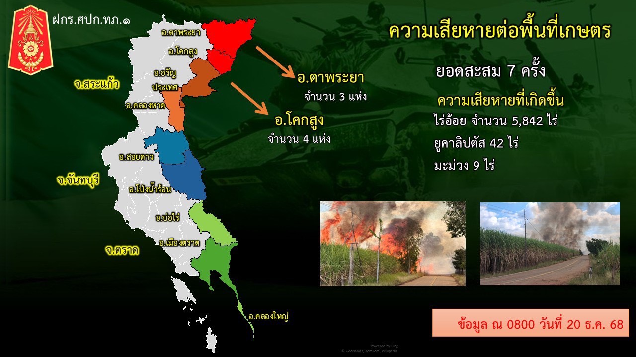 สรุปพื้นที่ที่ได้รับความเสียหาย จากฝ่ายกัมพูชาได้ยิง BM-21 และเครื่องยิงลูกระเบิด เข้ามายังพื้นทึ่ชายแดน จ.สระแก้ว(ตั้งแต่ 8 - 20 ธ.ค.68)ดังนี้