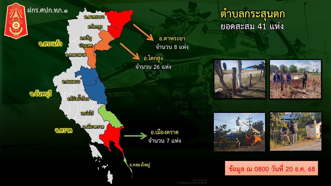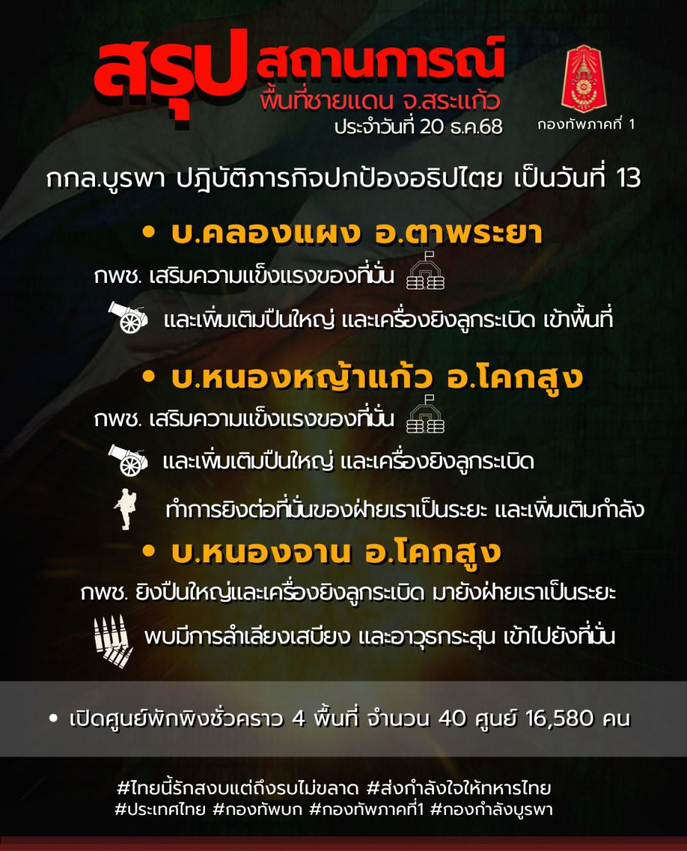 ศูนย์ปฏิบัติการกองทัพภาคที่ 1 สรุปสถานการณ์ชายแดนไทย-กัมพูชา พื้นที่ จ.สระแก้ว ประจำวัน 20 ธันวาคม 2568 เวลา 18.00 น.